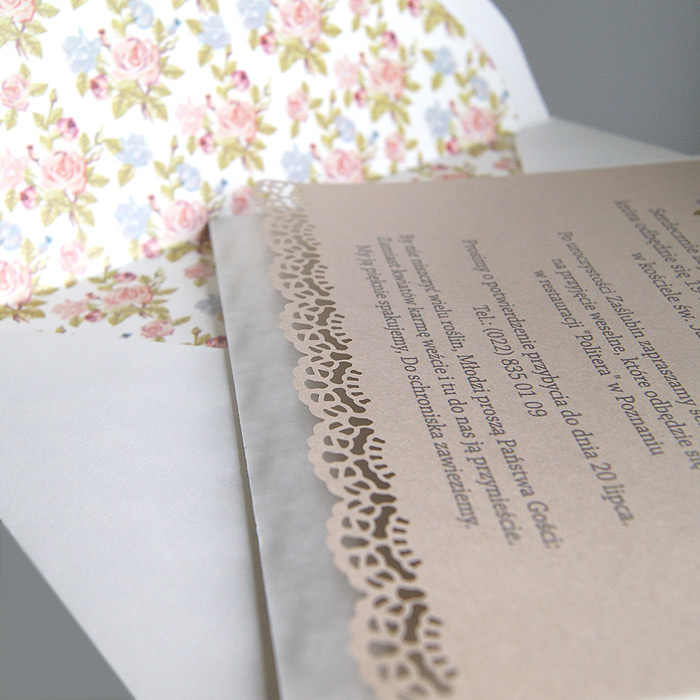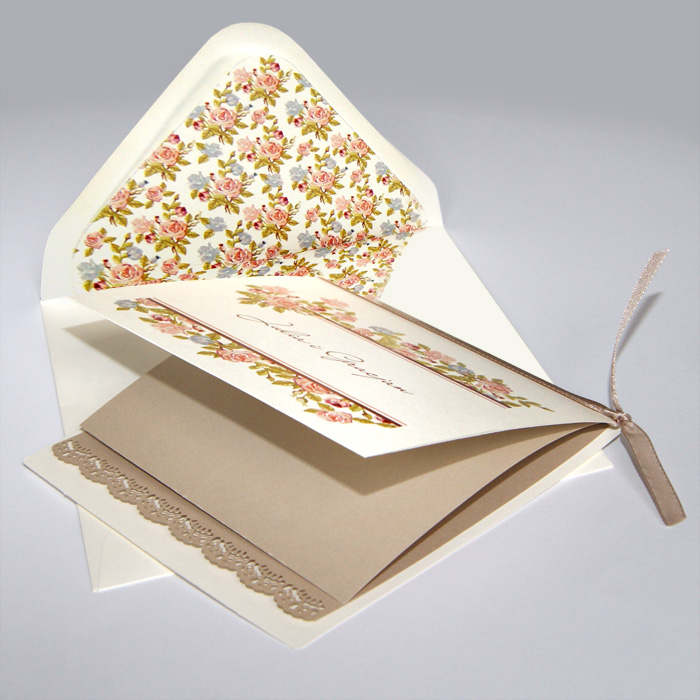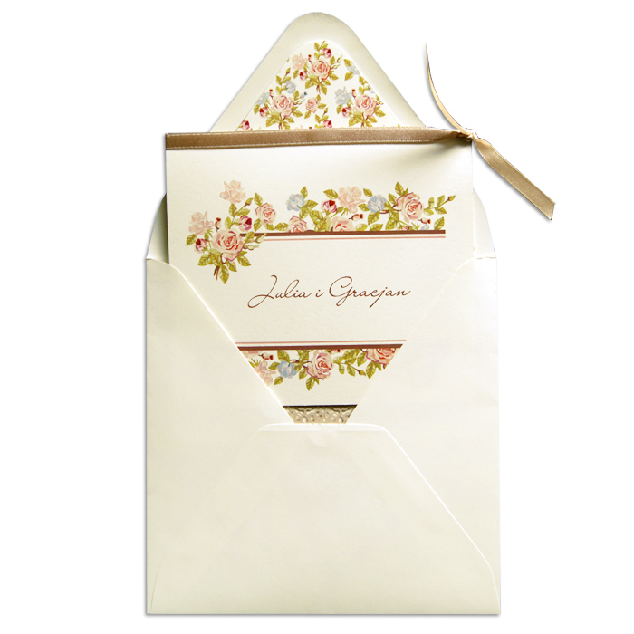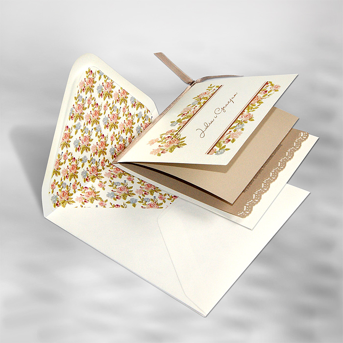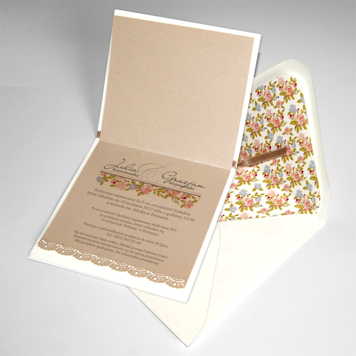 Oryginalne zaproszenie wykonane z matowego papieru w kolorze ecru. Okładkę ozdabia kolorowy motyw kwiatowy z miejscem na nadruk imion Młodej Pary. Dodatkową ozdobą jest satynowa wstąka w kolorze beżowym. Wkładka do nadruku z wysokiej jakości opalizującego papieru w kolorze beżowym zakończona koronką. Koperta z ozdobną wkładką, dopasowaną wzorniczo do zaproszenia. Zaproszenie wysyłamy w formie gotowej do wręczenia. Wykonane z ogromną starannością i dbałością o detale. Precyzyjny nadruk, dokładność wykonania oraz wysokiej jakości papier.