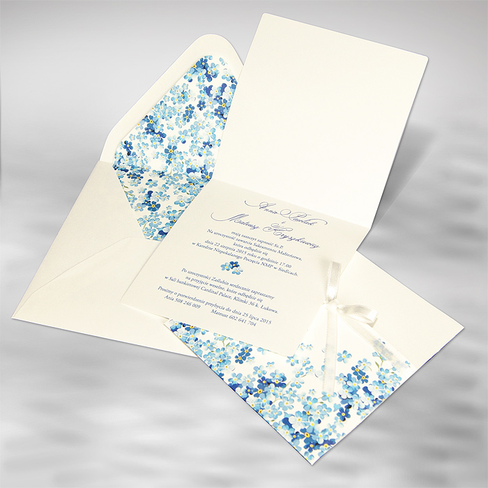 Oryginalne zaproszenie wykonane z matowego papieru w kolorze ecru. Okładkę ozdabia kolorowy motyw kwiatowy. Dodatkową ozdobą jest satynowa wstążka w kolorze ecru. Wkładka do nadruku ecru matowa. Koperta z ozdobną wkładką, dopasowaną wzorniczo do zaproszenia. Zaproszenie wysyłamy w formie gotowej do wręczenia. Wykonane z ogromną starannością i dbałością o detale. Precyzyjny nadruk, dokładność wykonania oraz wysokiej jakości papier.