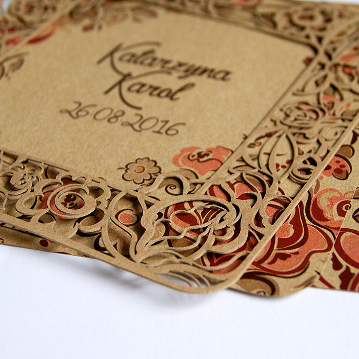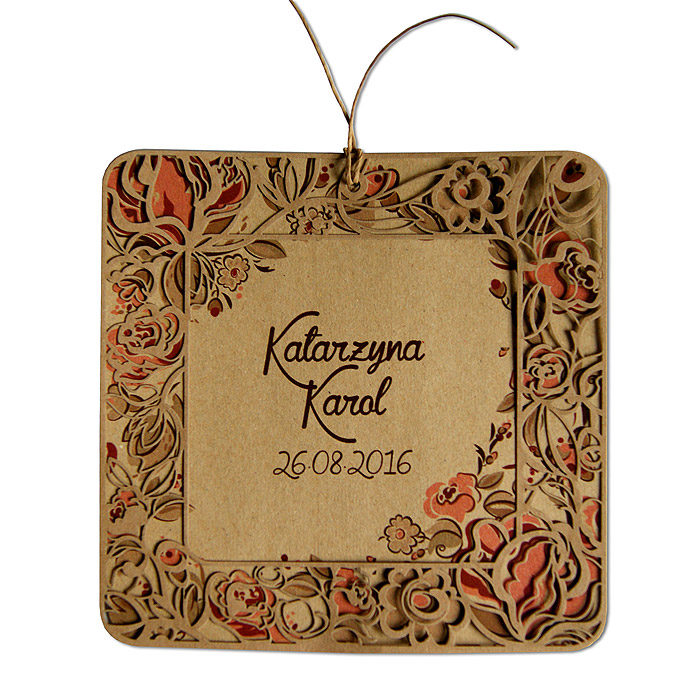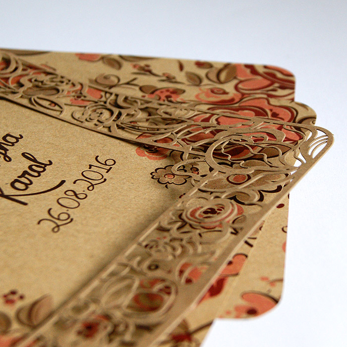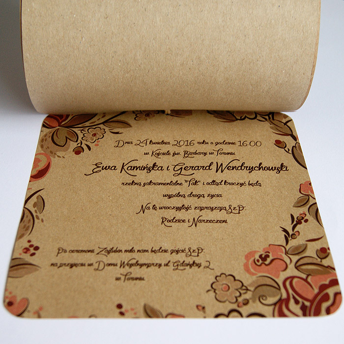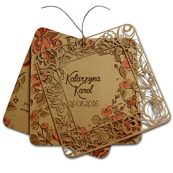 Oryginalne zaproszenie z papieru ekologicznego. Okładkę ozdabia wycięty laserowo ażurowy motyw kwiatowy, przez który widać kolorowy nadruk. Tekst drukowany na dwóch wkładkach z cienkiego papieru ekologicznego, połączony z okładką papierowym sznurkiem. Zaproszenie wysyłamy w formie gotowej do wręczenia. Zaproszenie wykonane z ogromną starannością i dbałością o detale. Precyzyjny nadruk, dokładność wykonania oraz wysokiej jakości papier.