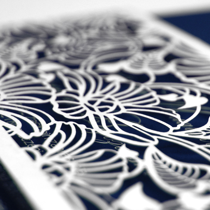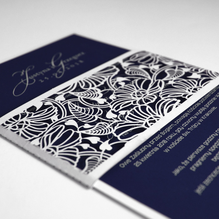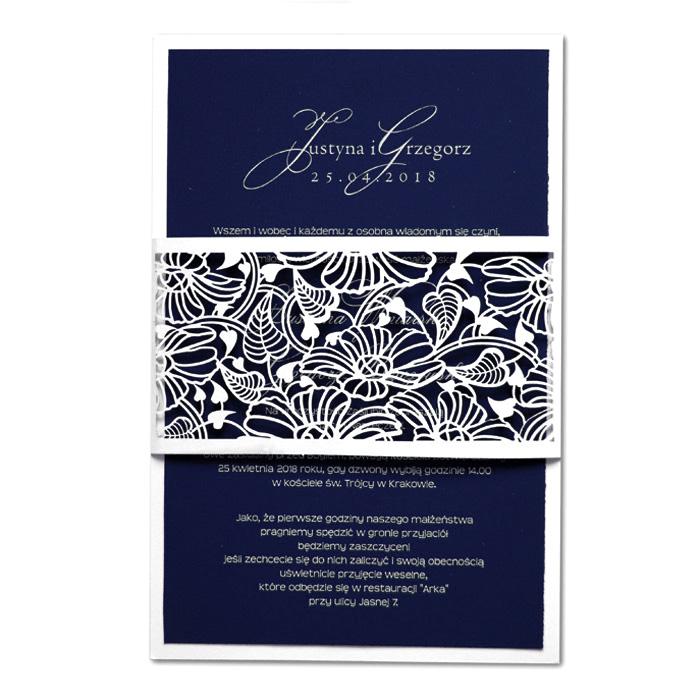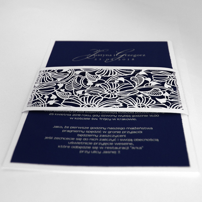 Oryginalne zaproszenie wykonane z matowego papieru z nowatorską techniką druku. Podkładka zaproszenia z papieru w kolorze białym, natomiast wkładka do nadruku z matowego papieru w kolorze granatowym, z białym nadrukiem dającym wyjątkowy efekt. Uroku dodaje wycięta laserowo, misterna banderola z papieru w kolorze białym. Zaproszenie wysyłamy w formie gotowej do wręczenia. Wykonane z ogromną starannością i dbałością o detale. Precyzyjny nadruk, dokładność wykonania oraz wysokiej jakości papier.