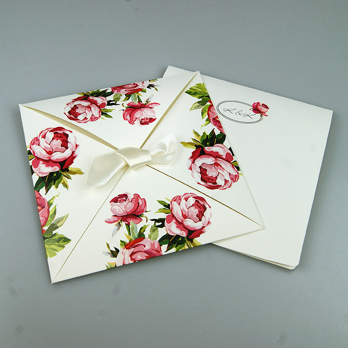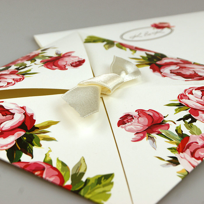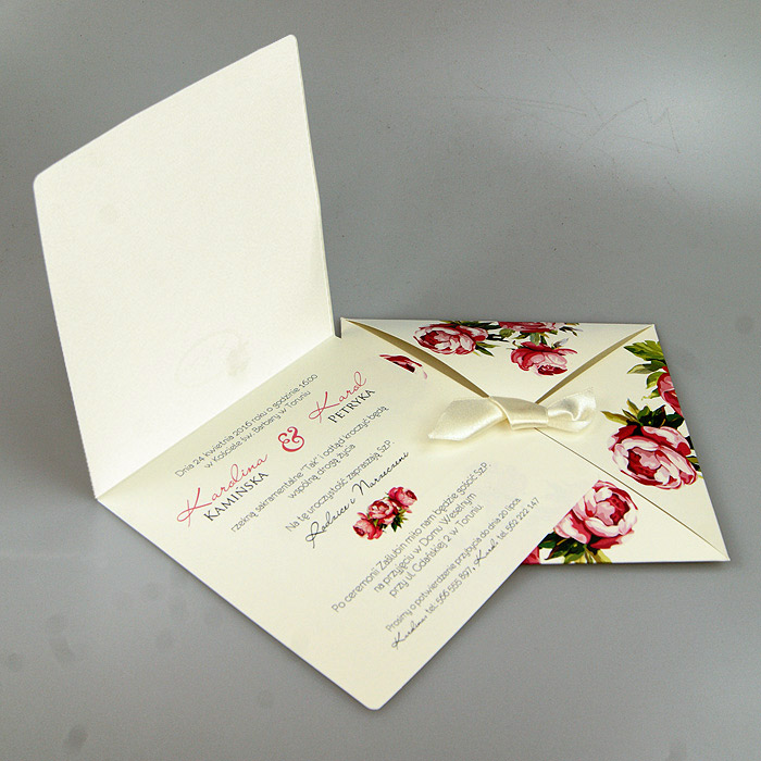 Zaproszenie ślubne wykonane z matowego papieru w kolorze ecru. Okładkę w formie koperty składanej z czterech części, ozdabia nadrukowany kwiatowy motyw. Wkładka do nadruku ecru matowa. Uroku dodaje satynowa wstążka, umieszczona w centralnej części zaproszenia.Zaproszenia wykonane z ogromną starannością i dbałością o detale. Precyzyjny nadruk, dokładność wykonania oraz wysokiej jakości papier.