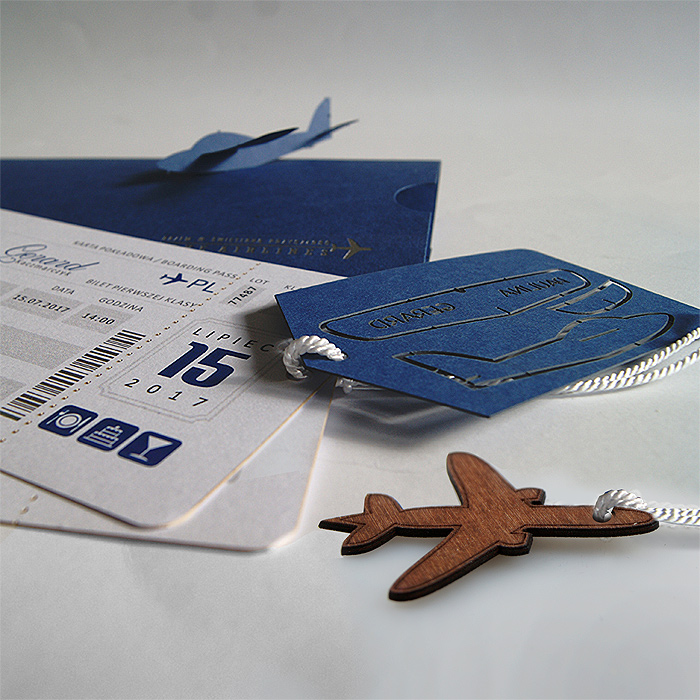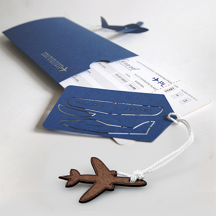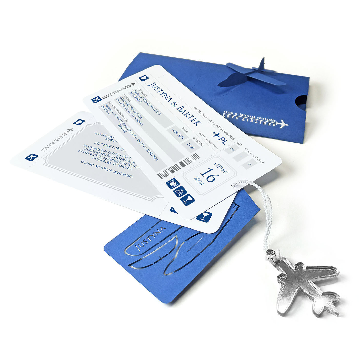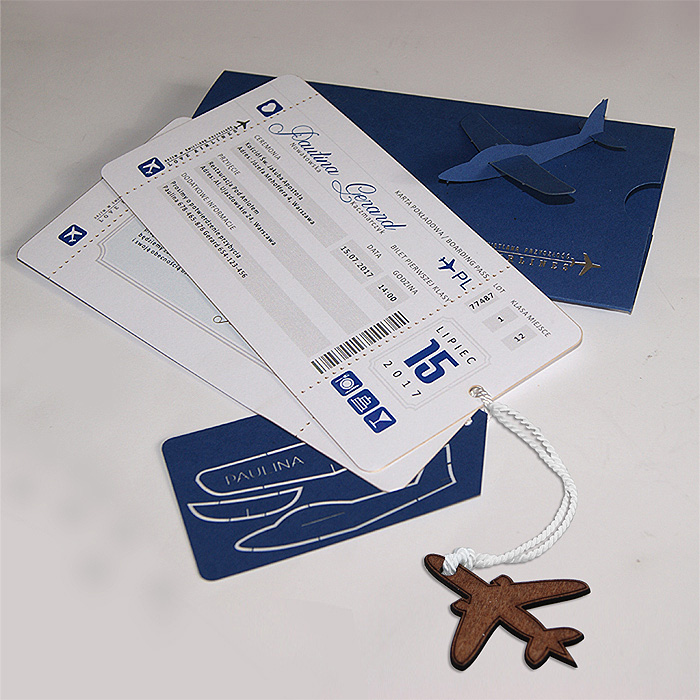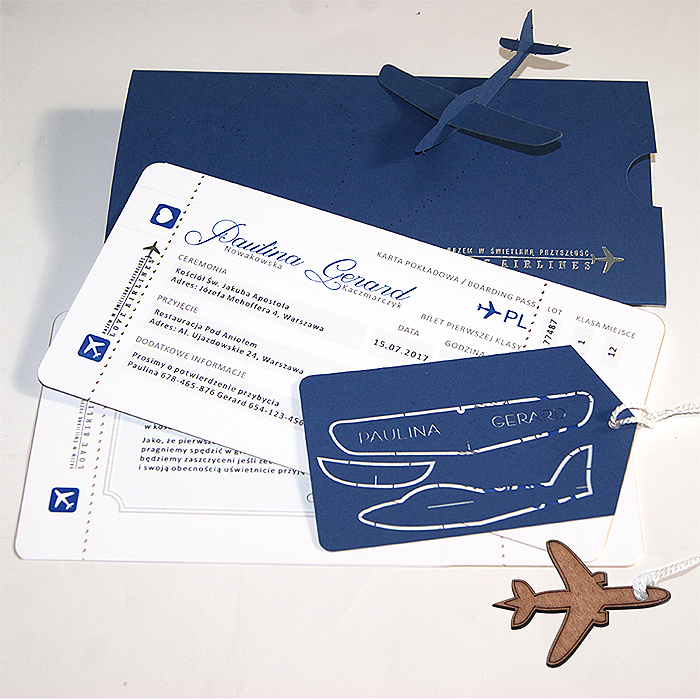 Wyjątkowe zaproszenie ślubne w formie biletu lotniczego, zaprojektowane dla miłośników podróży i nie tylko. Okładka wykonana z wysokiej jakości matowego papieru w kolorze granatowym. Okładkę ozdabia srebrzony napis i subtelny motyw serca, wyciętego technika laserową. Nadruk tekstu na dwóch osobnych kartkach stylizowanych na bilet lotniczy, połączonych białym sznurkiem zakończonym lustrzaną zawieszką w kształcie samolotu. Uroku dodaje wycięta laserowo zawieszka, z modelem samolotu do złożenia. Na skrzydłach wycięte laserowo imiona Młodej Pary. Zaproszenie wysyłamy w formie gotowej do wręczenia. Zaproszenie wykonane z ogromną starannością i dbałością o detale. Precyzyjny nadruk, dokładność wykonania oraz wysokiej jakości papier.