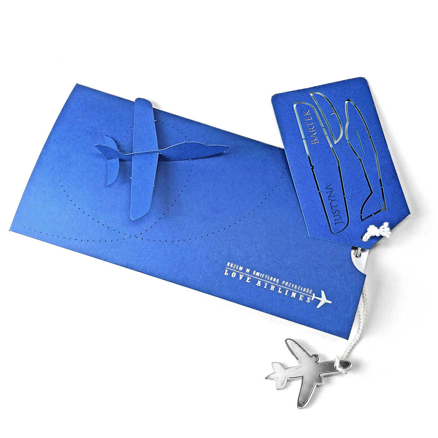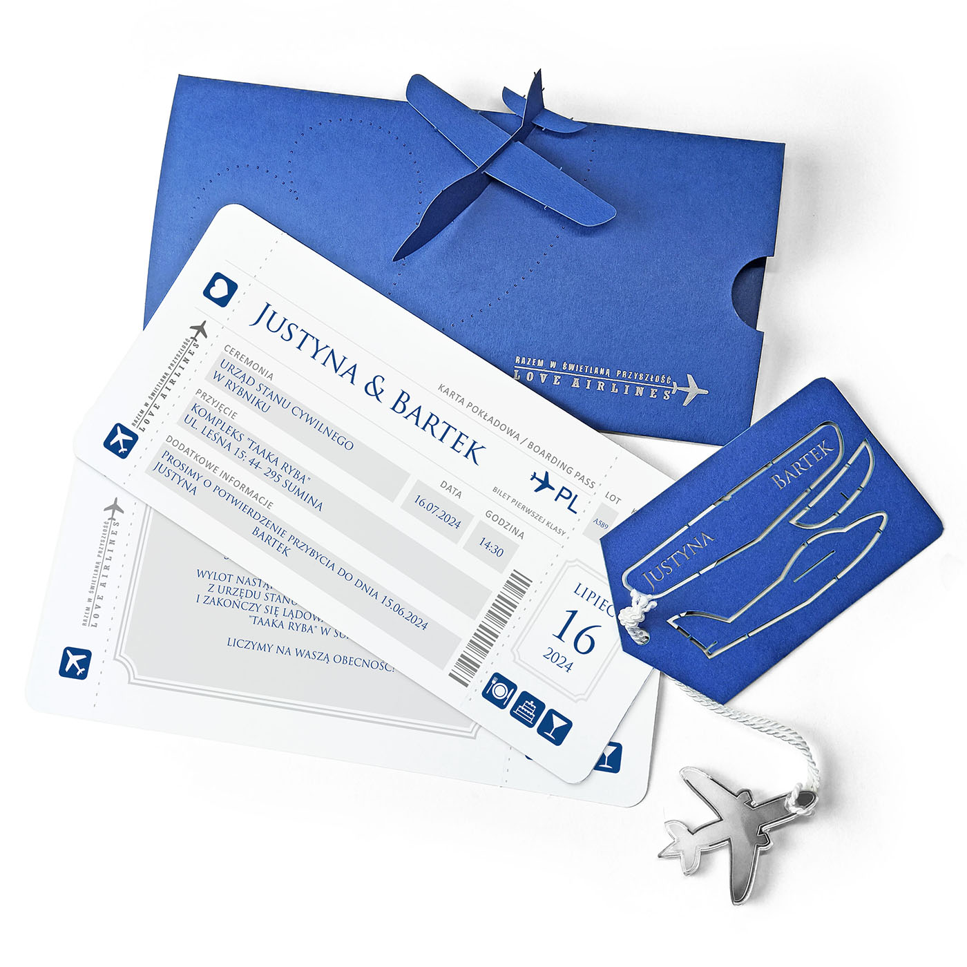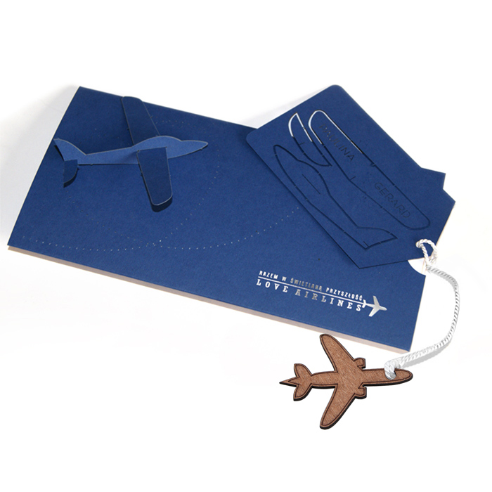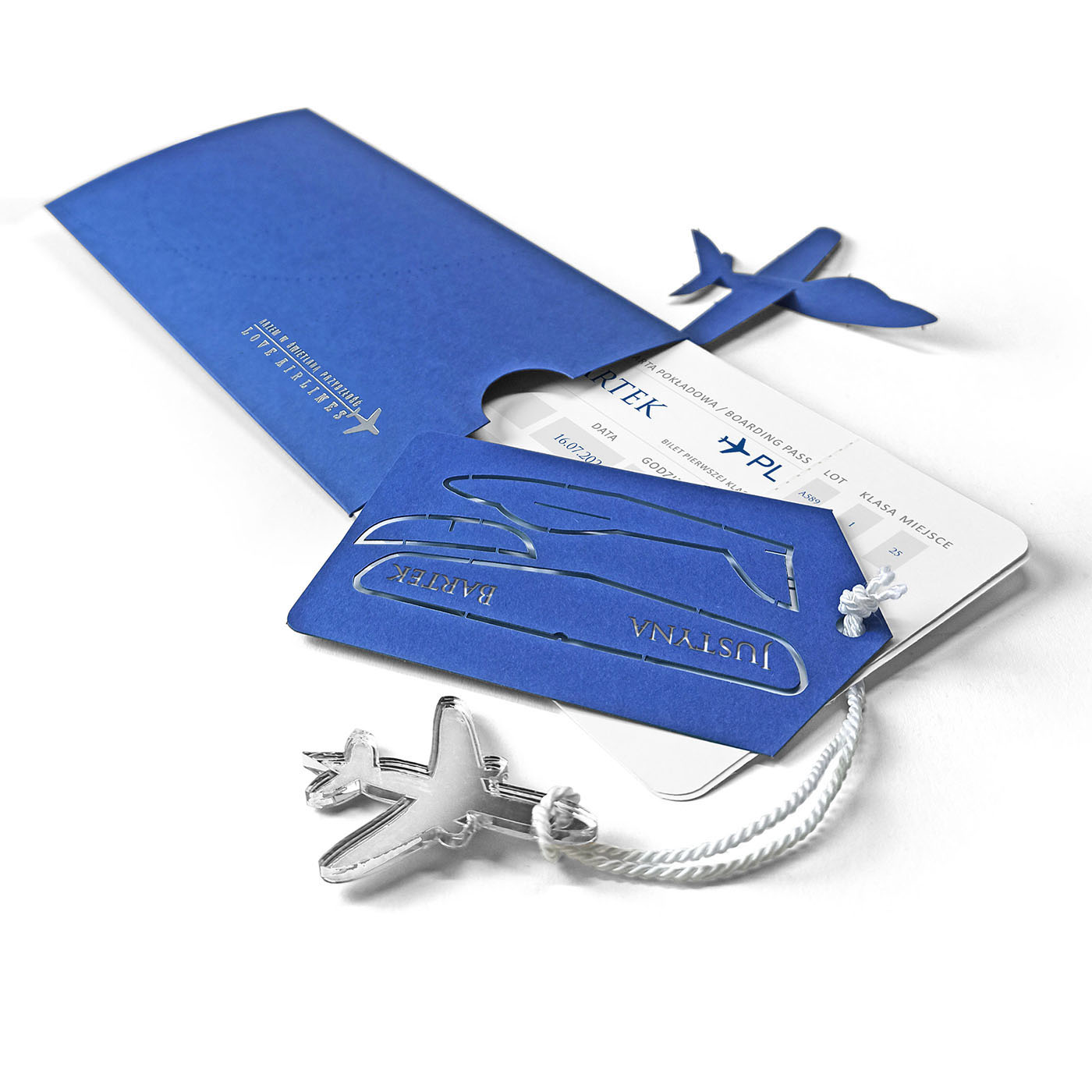 Wyjątkowe zaproszenie ślubne w formie biletu lotniczego, zaprojektowane dla miłośników podróży i nie tylko. Okładka wykonana z wysokiej jakości matowego papieru w kolorze granatowym. Okładkę ozdabia srebrzony napis i subtelny motyw serca, wyciętego technika laserową. Nadruk tekstu na dwóch osobnych kartkach stylizowanych na bilet lotniczy, połączonych białym sznurkiem zakończonym lustrzaną zawieszką w kształcie samolotu. Uroku dodaje wycięta laserowo zawieszka, z modelem samolotu do złożenia. Na skrzydłach wycięte laserowo imiona Młodej Pary. Zaproszenie wysyłamy w formie gotowej do wręczenia. Zaproszenie wykonane z ogromną starannością i dbałością o detale. Precyzyjny nadruk, dokładność wykonania oraz wysokiej jakości papier.