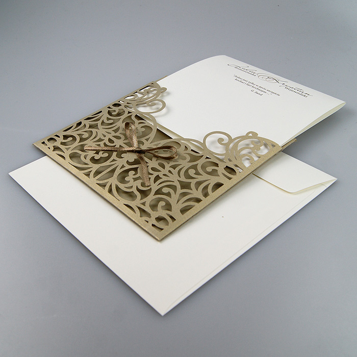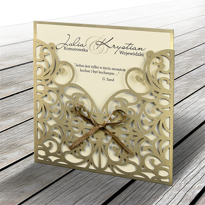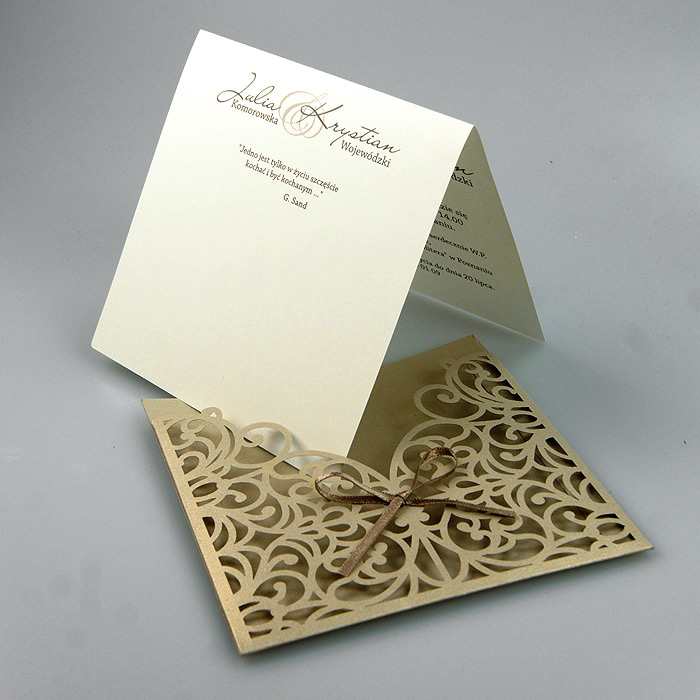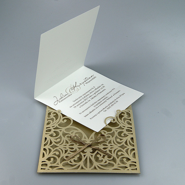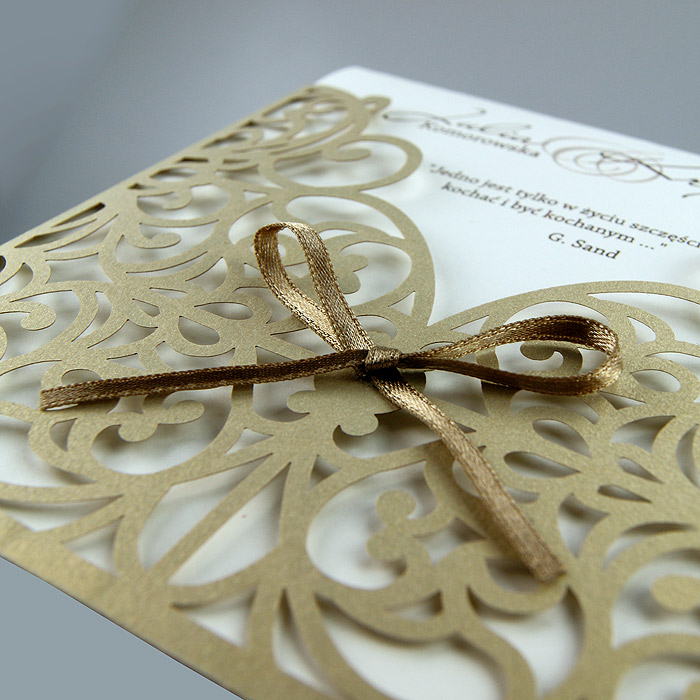 Okładka zaproszenia w kształcie kieszonki wykonana z wysokiej jakości metalizowanego papieru w kolorze starego złota. Okładkę ozdabia ażurowe wycięcie laserowe, oraz satynowa wstążka. Wkładka do nadruku tekstu matowa w kolorze ecru. Zaproszenie wysyłamy w formie gotowej do wręczenia. Zaproszenie wykonane z ogromną starannością i dbałością o detale. Precyzyjny nadruk, dokładność wykonania oraz wysokiej jakości papier.