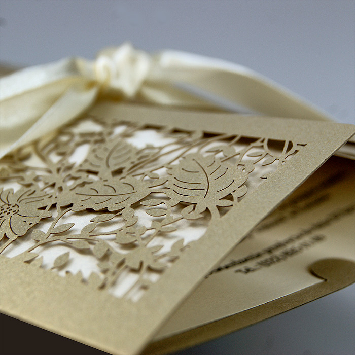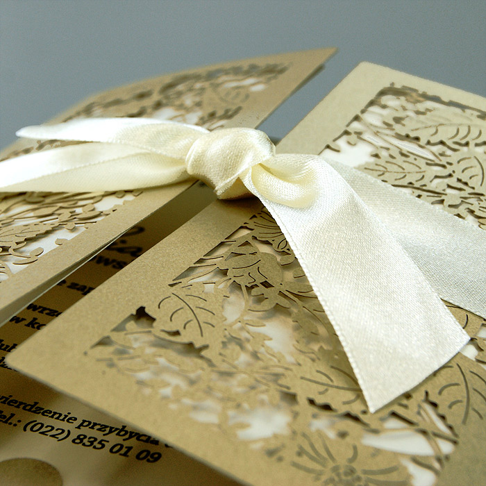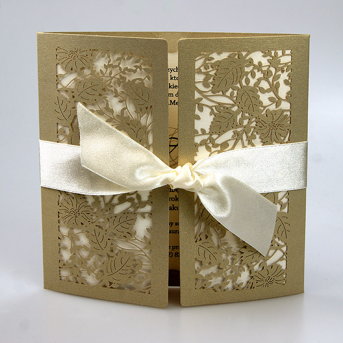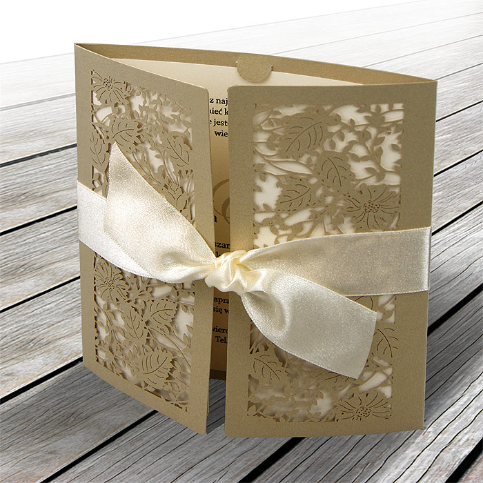 Zaproszenie w formie bramki, wykonane z wysokiej jakości metalizowanego papieru, barwionego w masie w kolorze starego złota. Okładkę ozdabia ażurowe, misterne wycięcie laserowe z motywem roślinnym. Zaproszenie przewiązane satynową wstążką w kolorze ecru. Wkładka do nadruku tekstu metalizowana w kolorze ecru. Zaproszenie wysyłamy w formie gotowej do wręczenia. Zaproszenie wykonane z ogromną starannością i dbałością o detale. Precyzyjny nadruk, dokładność wykonania oraz wysokiej jakości papier.