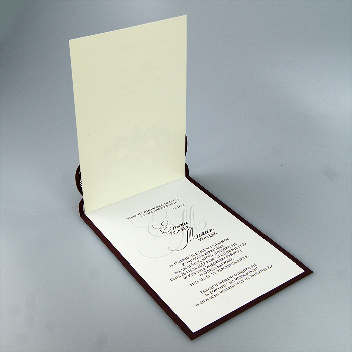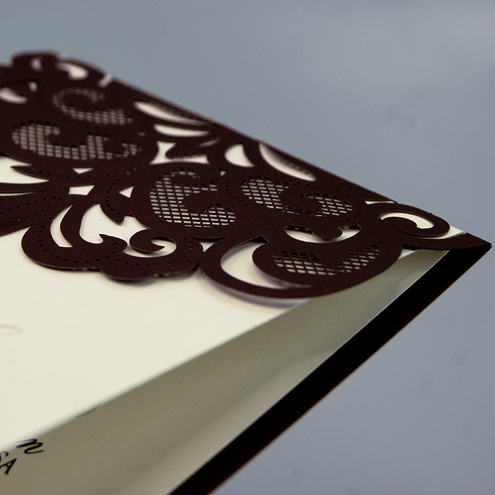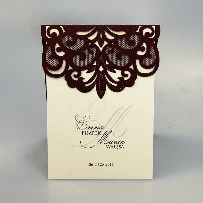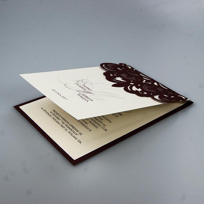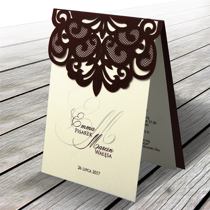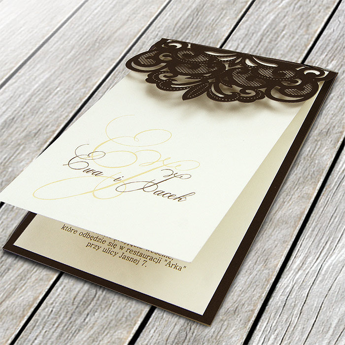 Oryginalne zaproszenie wykonane z matowego papieru w kolorze brązowym z wkładką w kolorze ecru. Okładkę ozdabia ażurowy motyw wycięty laserowo. Na pierwszej stronie miejsce do nadrukowania imion Młodej Pary i daty ślubu.