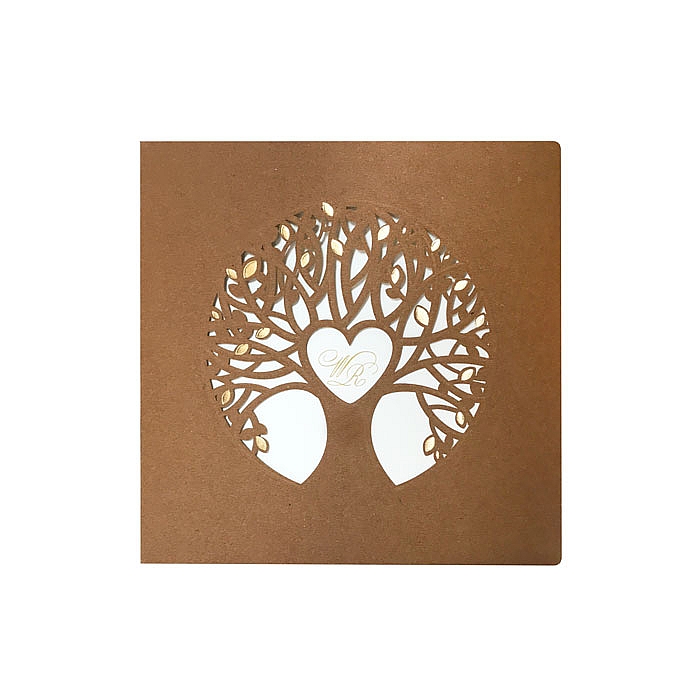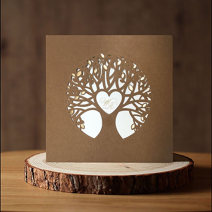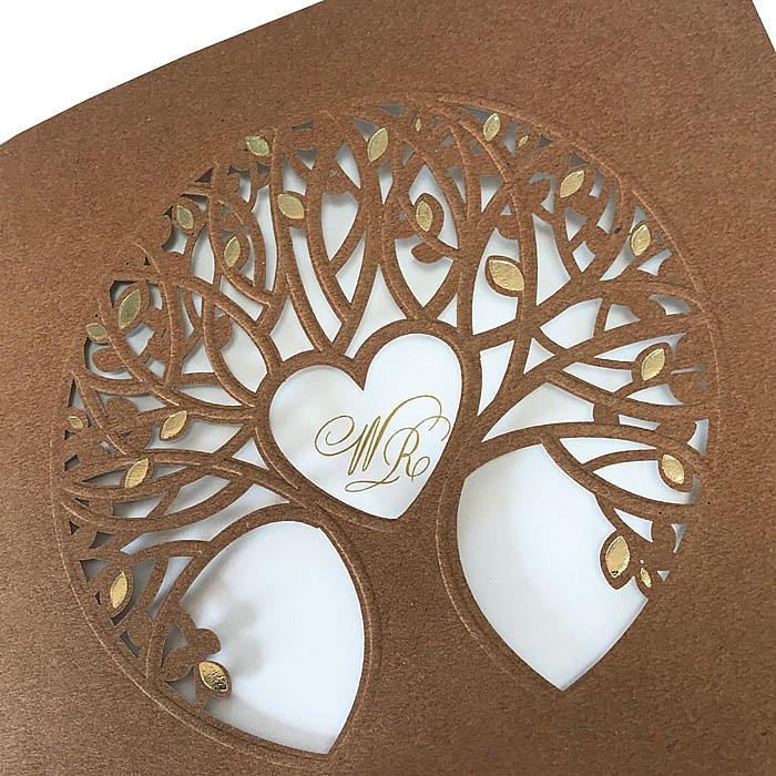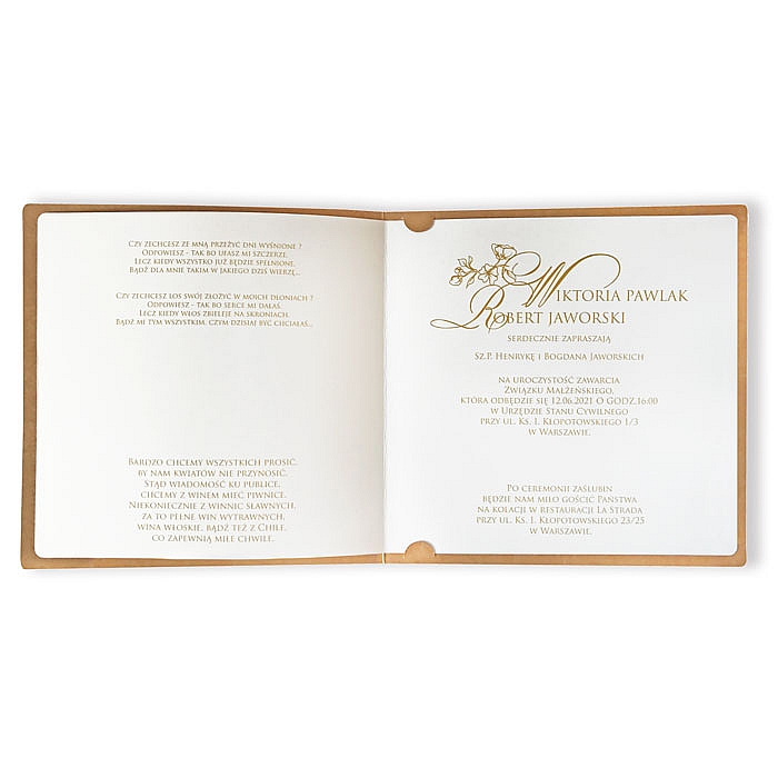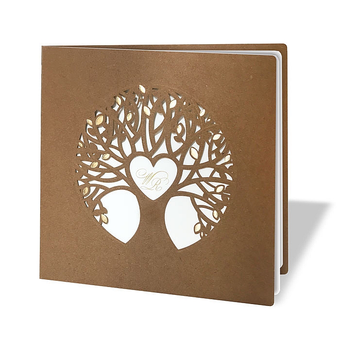 Zaproszenie ślubne wykonane z wysokiej jakości ekologicznego papieru. Okładkę zdobi wytłoczone i wycięte laserowo drzewo z subtelnym uszlachetnieniem w postaci złocenia. Wkładka do nadruku wykonana z wysokiej jakości matowego papieru w kolorze ecru. Zaproszenie wysyłamy w formie gotowej do wręczenia. Zaproszenie wykonane z ogromną starannością i dbałością o detale. Precyzyjny nadruk, dokładność wykonania