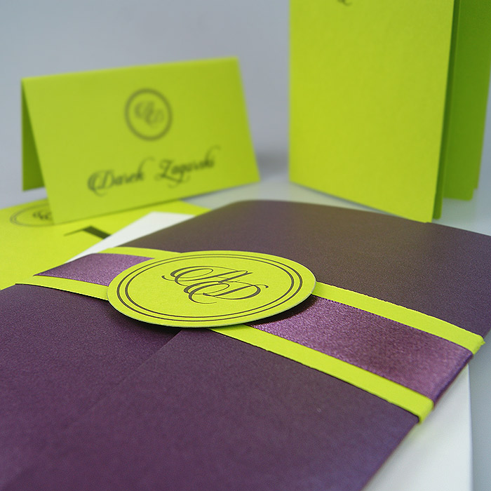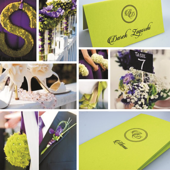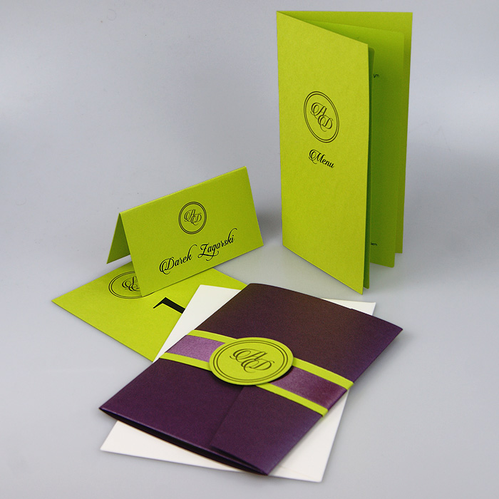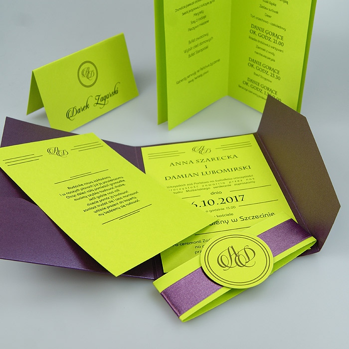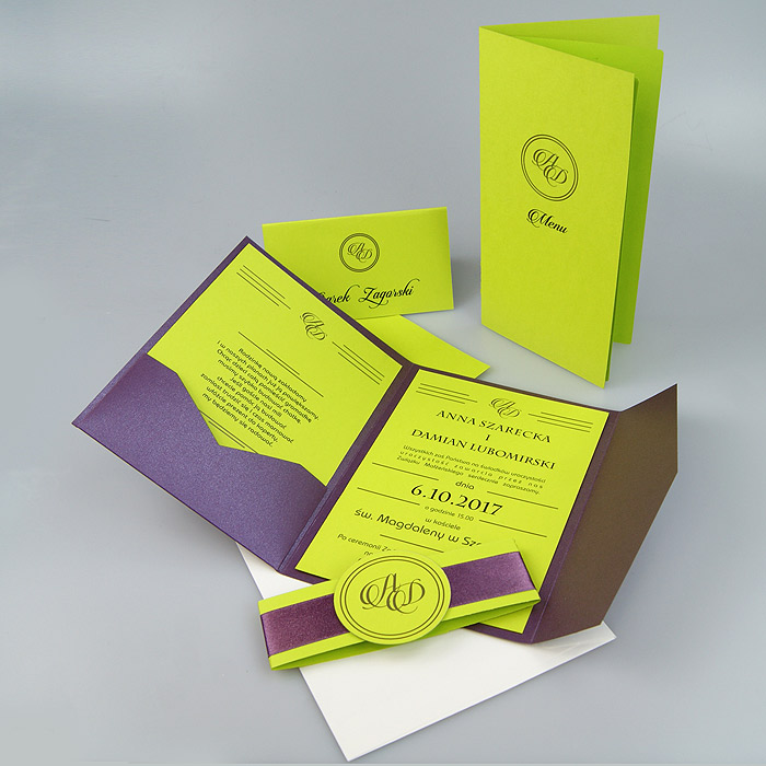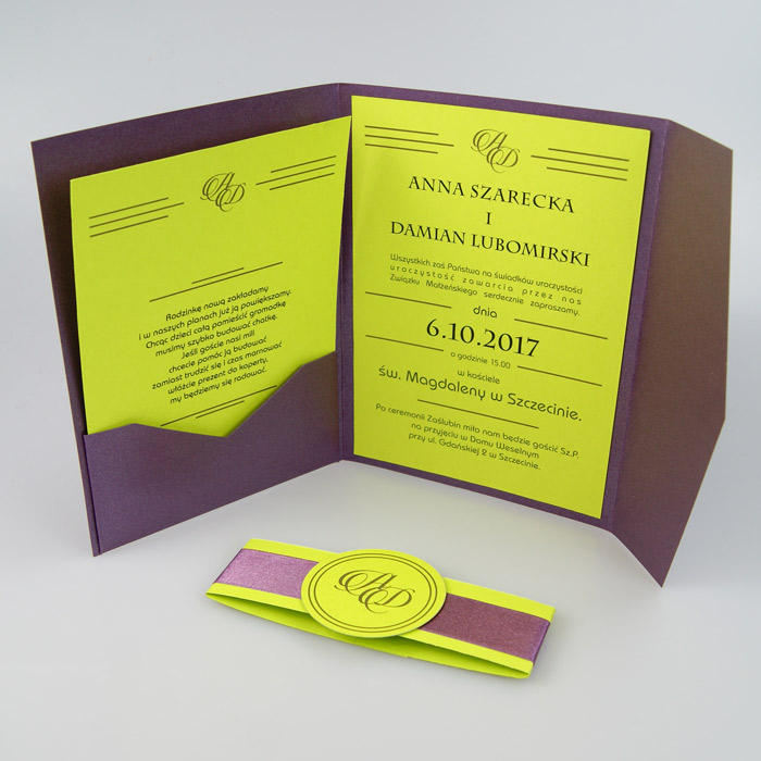 Nowoczesne zaproszenie ślubne w intensywnej kolorystyce, wykonane z wysokiej jakości metalizowanego papieru w kolorze fioletowym. Okładkę ozdabia matowa banderola w kolorze soczystej zieleni połączona z fioletową satynową wstążka i aplikacją z nadrukowanymi inicjałami Młodej Pary. W centralnej części znajduje się wklejona zielona matowa wkładka, natomiast z lewej strony wkładka umieszczona w kieszonce. Zaproszenie wysyłamy w formie gotowej do wręczenia. Zaproszenie wykonane z ogromną starannością i dbałością o detale. Precyzyjny nadruk, dokładność wykonania oraz wysokiej jakości papier.