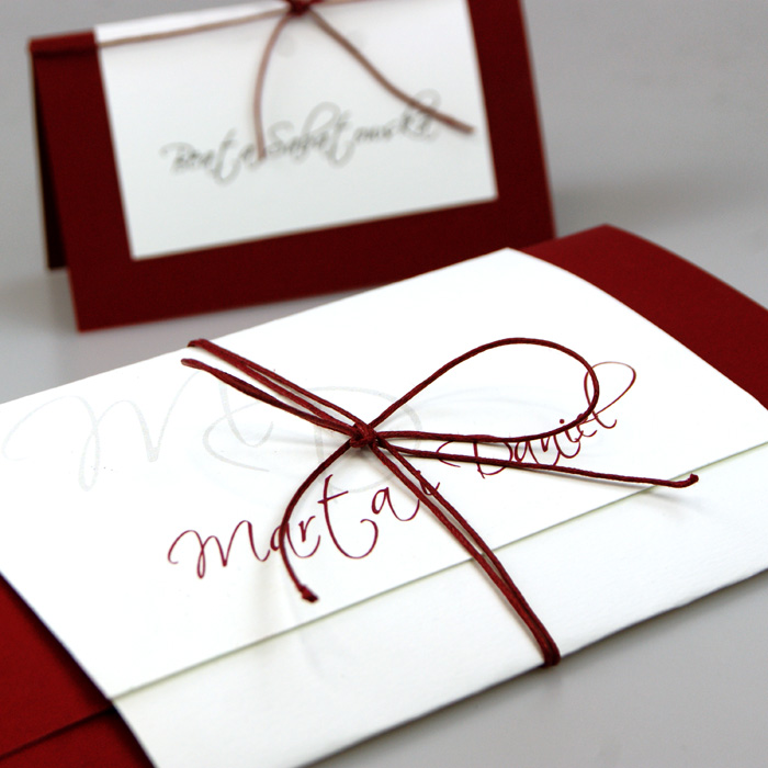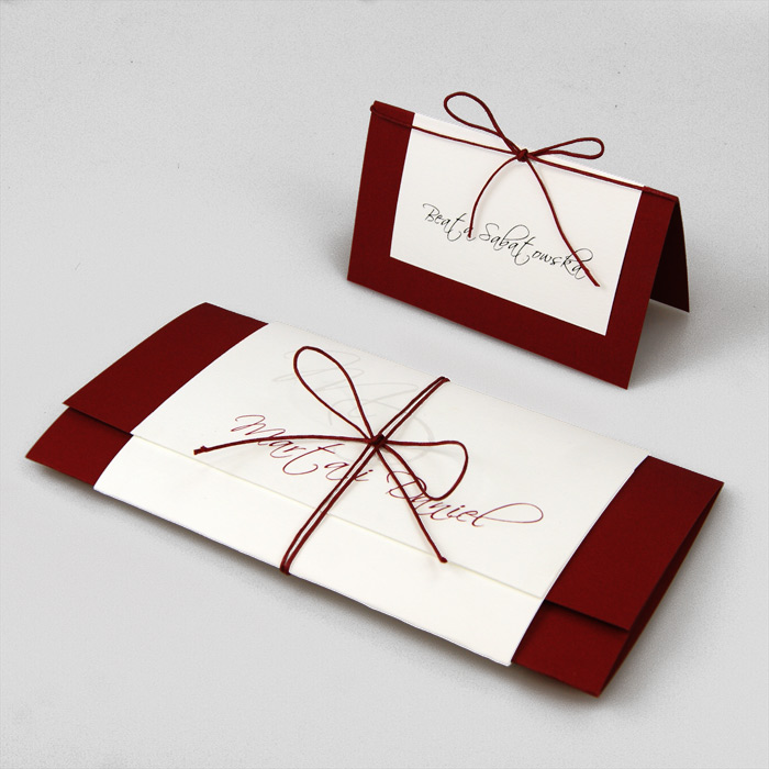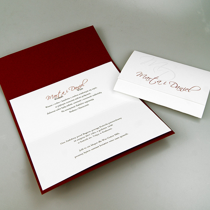 Zaproszenie ślubne, wykonane z wysokiej jakości matowego papieru w kolorze bordowym. Prostą w formie okładkę ozdabia banderola z matowego papieru w kolorze złamanej bieli z nadrukowanymi imionami Młodej Pary. Uroku dodaje kokardka wykonana z bordowego sznurka. Wkładka do nadruku z delikatnie fakturowanego papieru 250g. Zaproszenie wysyłamy w formie gotowej do wręczenia. Zaproszenie wykonane z ogromną starannością i dbałością o detale. Precyzyjny nadruk, dokładność wykonania oraz wysokiej jakości papier.