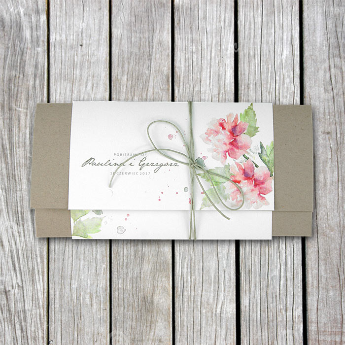 Zaproszenie ślubne, wykonane z wysokiej jakości matowego papieru barwionego w masie w kolorze szarym. Prostą w formie okładkę ozdabia banderola z matowego papieru w kolorze złamanej bieli z nadrukowanymi barwnymi kwiatami. Uroku dodaje kokardka wykonana z jasnoszarego sznurka. Wkładka do nadruku z delikatnie fakturowanego papieru 250g. Zaproszenie wysyłamy w formie gotowej do wręczenia. Zaproszenie wykonane z ogromną starannością i dbałością o detale. Precyzyjny nadruk, dokładność wykonania oraz wysokiej jakości papier.