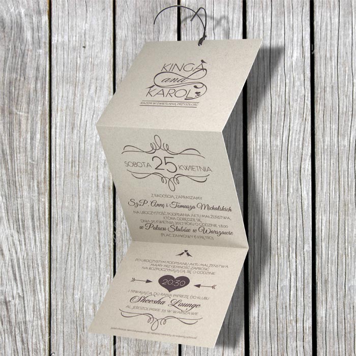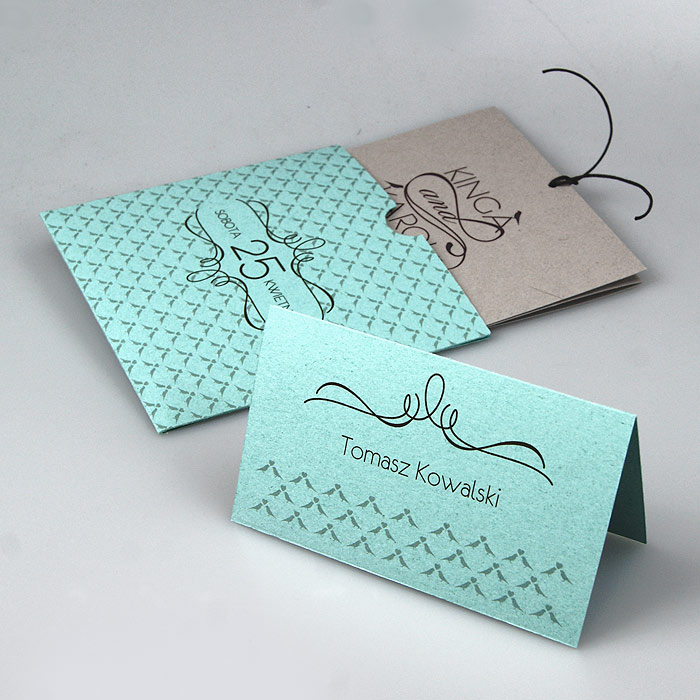 Nowoczesne zaproszenie ślubne z wysokiej jakości matowego papieru ozdobnego w odcieniu mięty. Zaproszenie w formie kieszonki, z miejscem do nadruku daty ślubu. Wkładka wykonana z szarego matowego papieru, składana na trzy części, przewiązana brązowym sznurkiem. Zaproszenie wykonane z ogromną starannością i dbałością o detale. Precyzyjny nadruk, dokładność wykonania oraz wysokiej jakości papier.