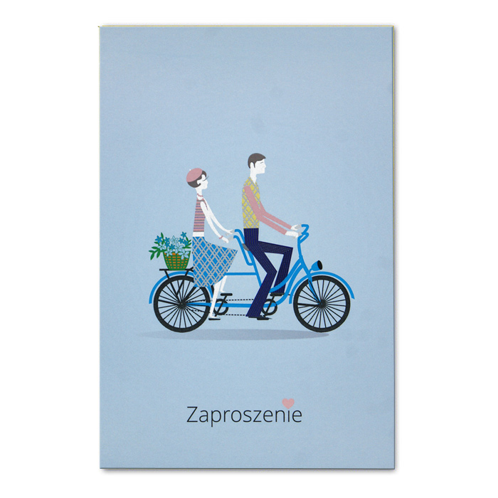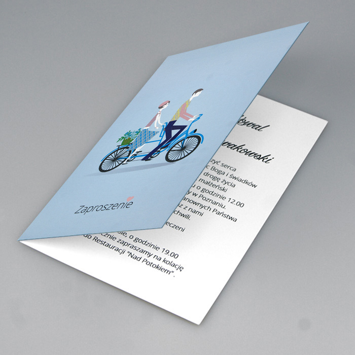 Autorskie zaproszenie wykonane z papieru kredowego 350g. Na okładce znajduje się barwna ilustracja Młodej Pary. Nadruk tekstu bezpośrednio na okładce. Zaproszenie wysyłamy w formie gotowej do wręczenia. Wykonane z ogromną starannością i dbałością o detale. Precyzyjny nadruk, dokładność wykonania oraz wysokiej jakości papier.