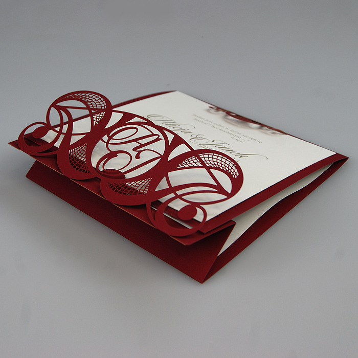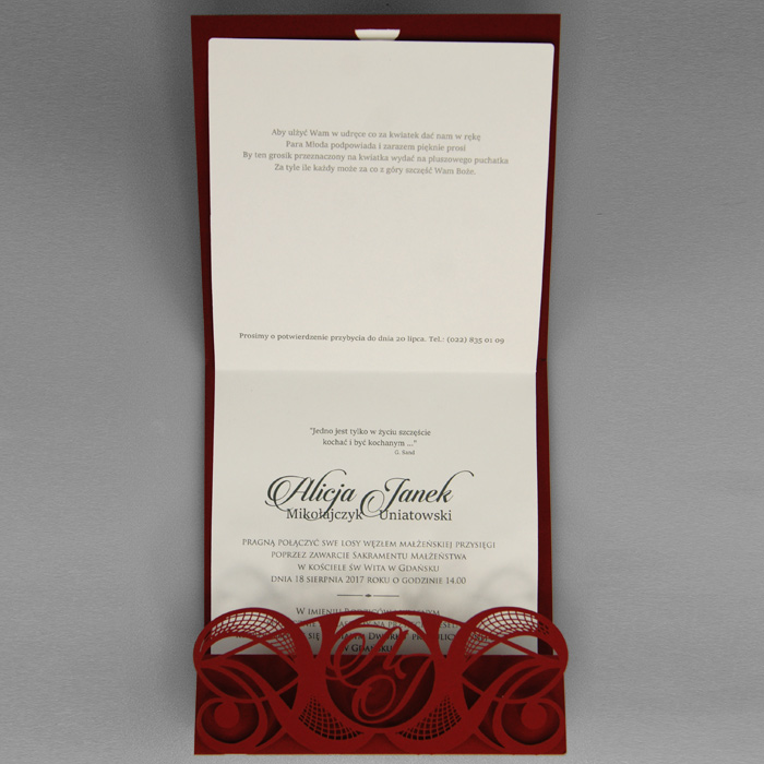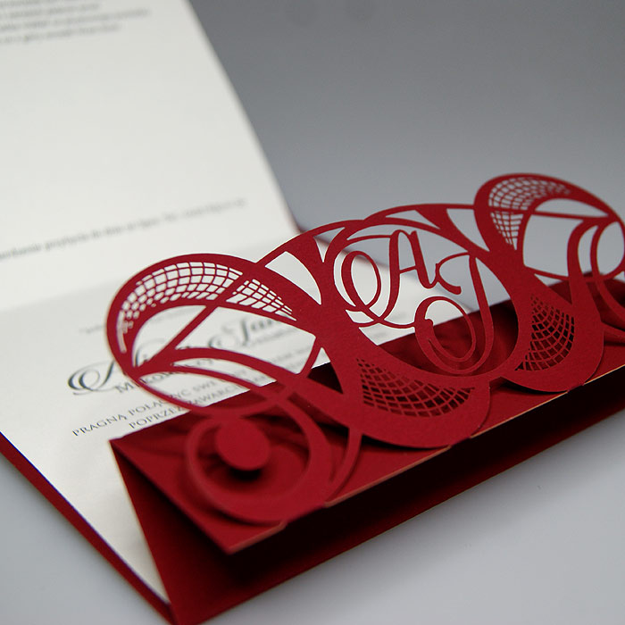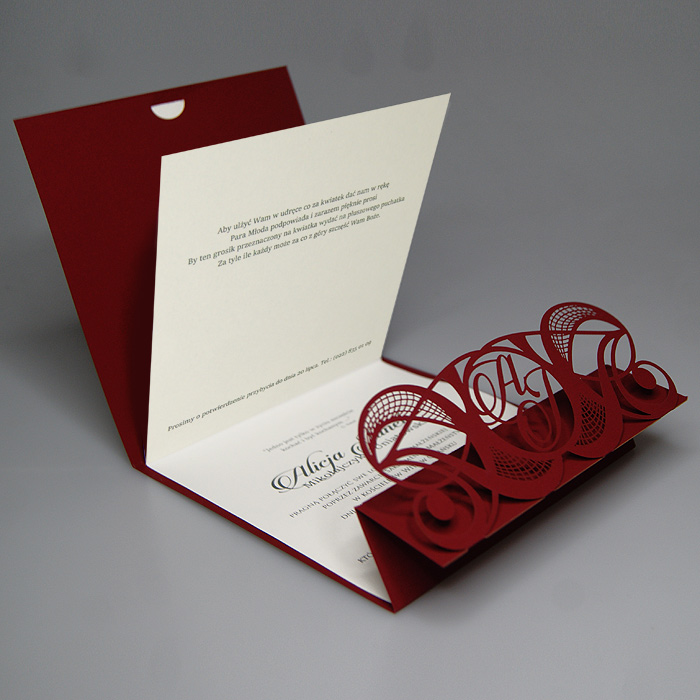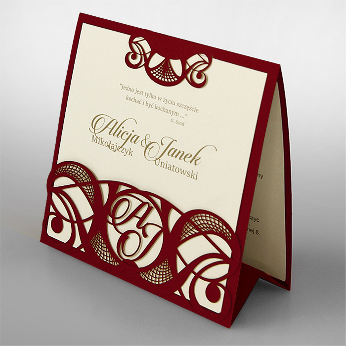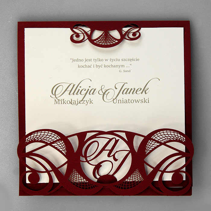 Oryginalne zaproszenie z misternym wycięciem laserowym, wykonane z matowego papieru w kolorze bordowym z wkładką do nadruku ecru matową. W ażurowy motyw okładki wplecione są inicjały Młodej Pary. Zaproszenie wysyłamy w formie gotowej do wręczenia. Wykonane z ogromną starannością i dbałością o detale. Precyzyjny nadruk, dokładność wykonania oraz wysokiej jakości papier.