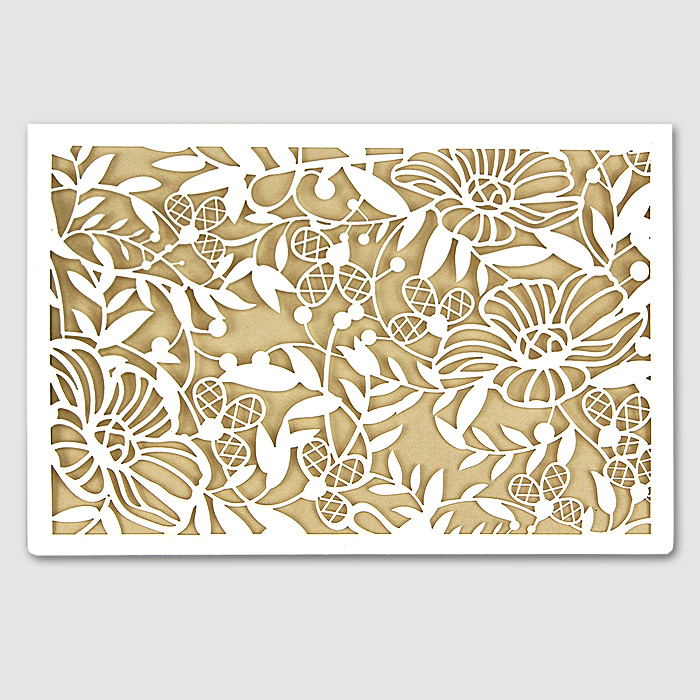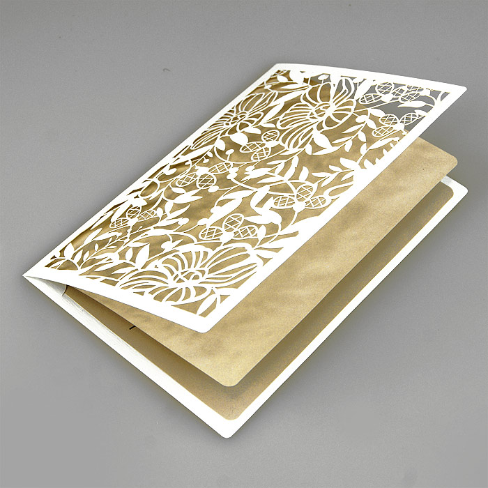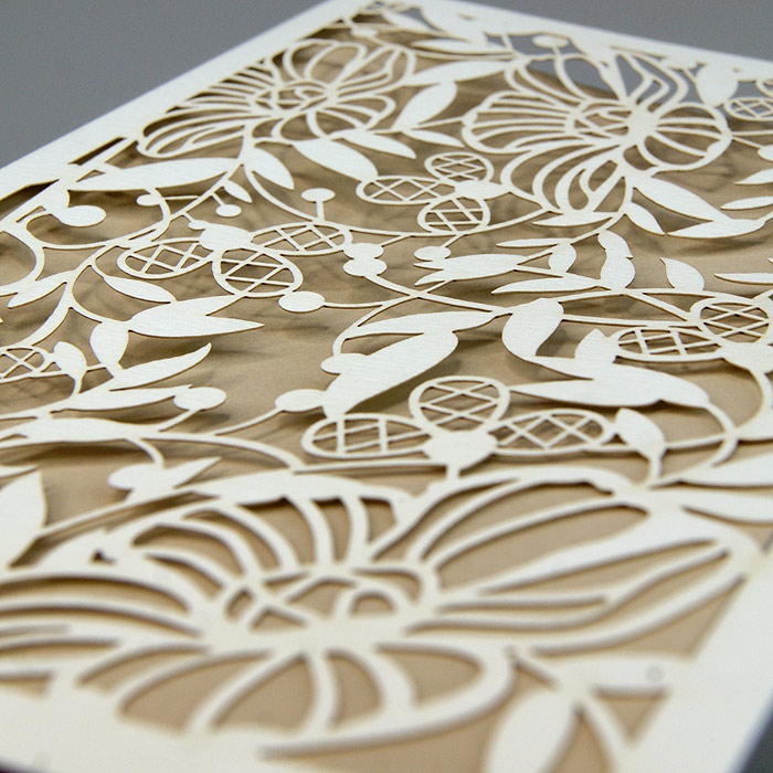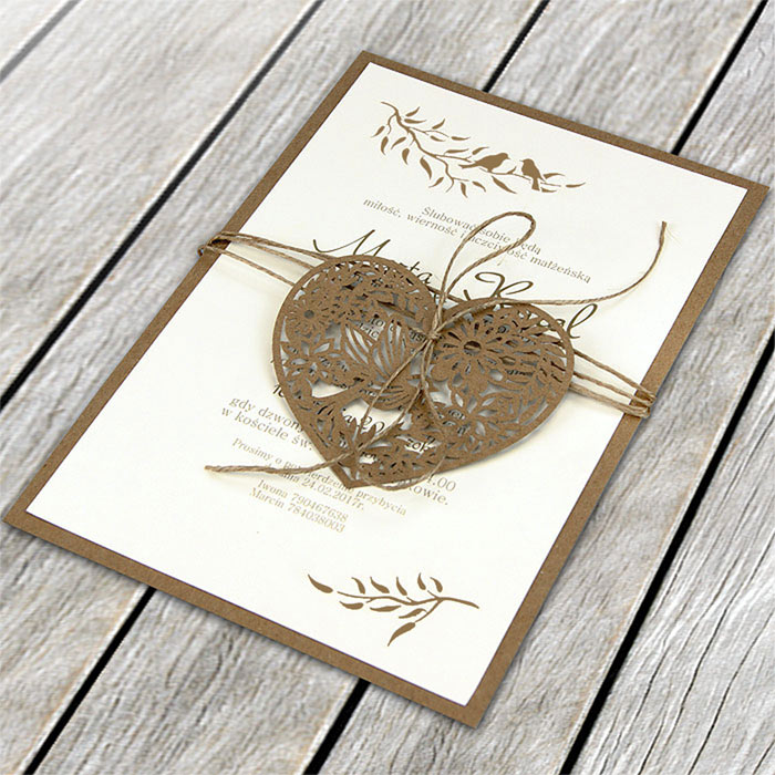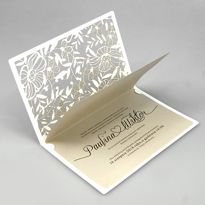 Oryginalne zaproszenie z misternym wycięciem laserowym, wykonane z wysokiej jakości matowego, delikatnie fakturowanego papieru w kolorze złamanej bieli z wkładką do nadruku wykonanej w matowego papieru w kolorze beżowym. Zaproszenie wysyłamy w formie gotowej do wręczenia. Wykonane z ogromną starannością i dbałością o detale. Precyzyjny nadruk, dokładność wykonania oraz wysokiej jakości papier.