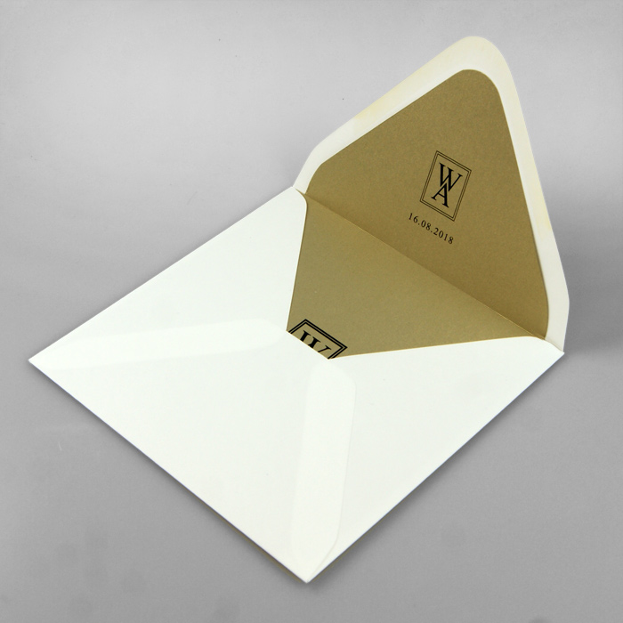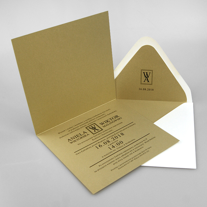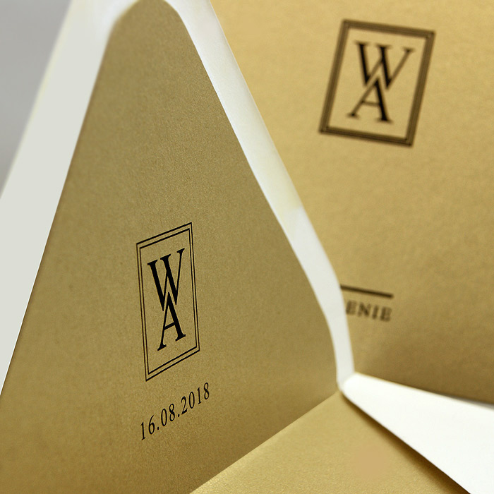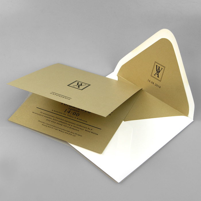 Wyjątkowe zaproszenie wykonane z wysokiej jakości metalizowanego papieru w kolorze starego złota. Nadruk tekstu bezpośrednio na okładce. Koperta z wkładką w kolorze starego złota z nadrukowanymi monogramami Pary Młodej, tworzy wraz z zaproszeniem klasyczny komplet. Zaproszenie wysyłamy w formie gotowej do wręczenia. Wykonane z ogromną starannością i dbałością o detale. Precyzyjny nadruk, dokładność wykonania oraz wysokiej jakości papier.