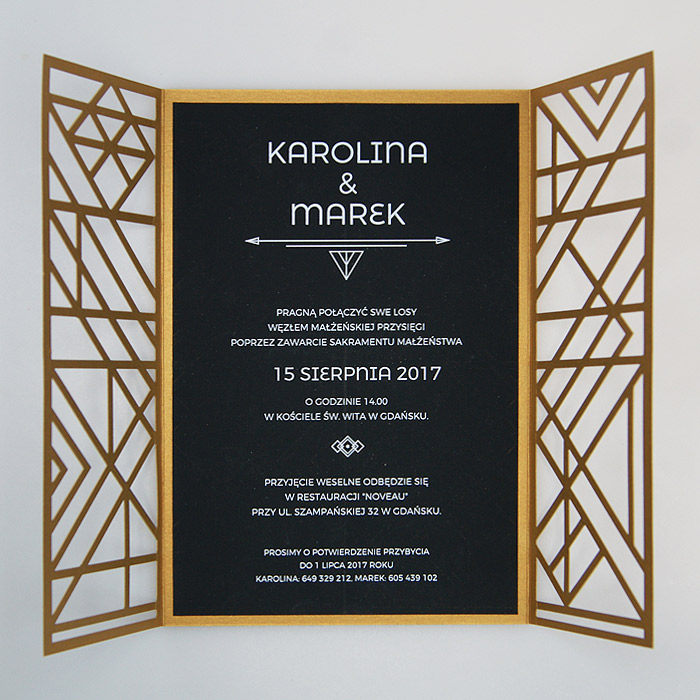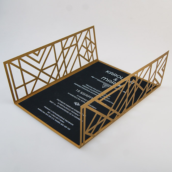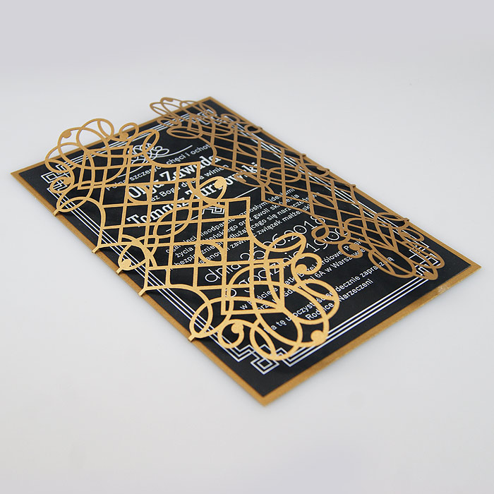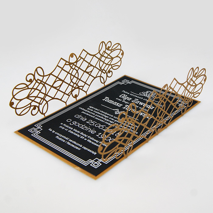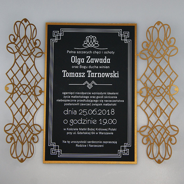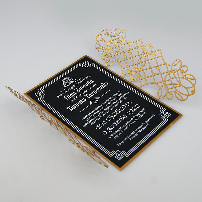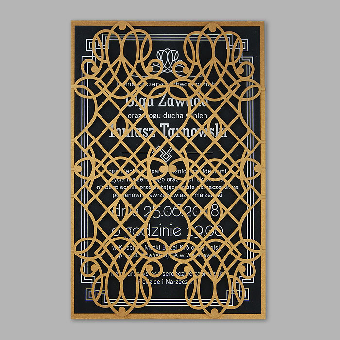 Wyjątkowe zaproszenie w stylu nawiązującym do Art Deco. Okładka wykonana z wysokiej jakości metalizowanego papieru w kolorze antycznego złota,z ażurowym wycięciem laserowym. Wkładka do nadruku podklejona do zaproszenia, wykonana z czarnego matowego papieru barwionego w masie. Nadruk tekstu w kolorze białym. W tym zaproszeniu nie jest możliwa personalizacja w treści zaproszenia.