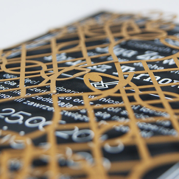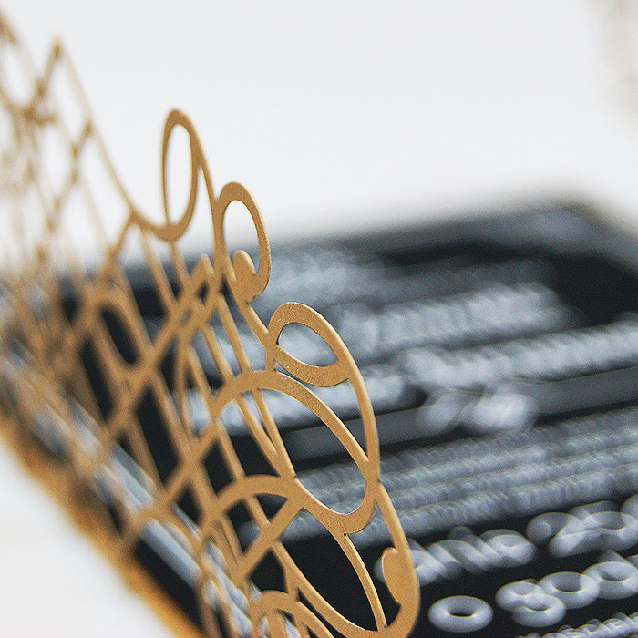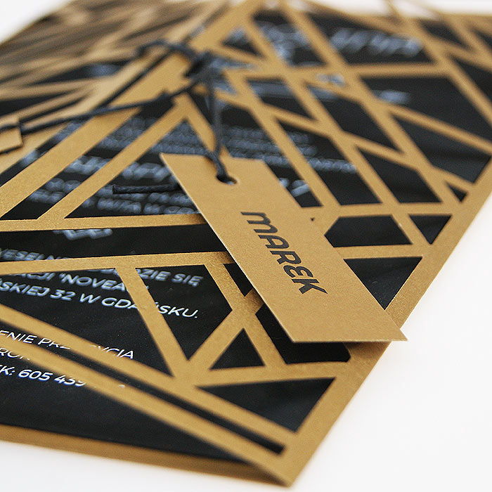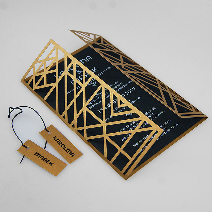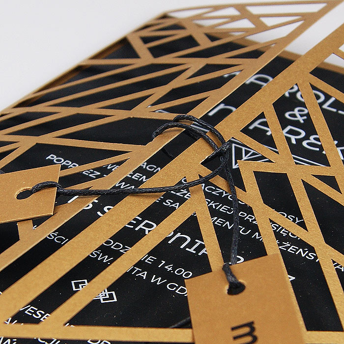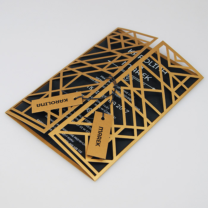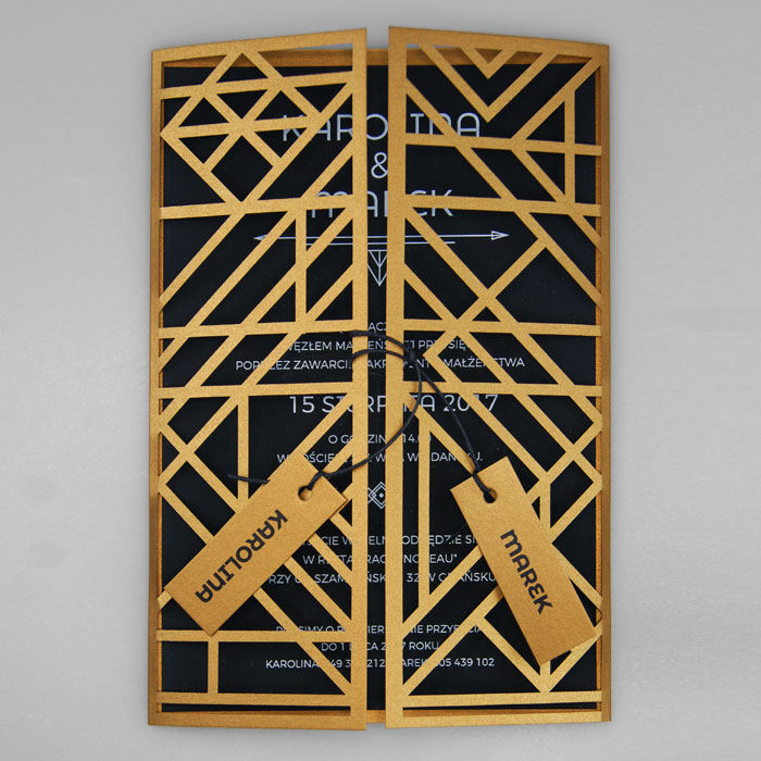 Wyjątkowe zaproszenie w stylu nawiązującym do Art Deco. Okładka wykonana z wysokiej jakości metalizowanego papieru w kolorze antycznego złota,z ażurowym wycięciem laserowym. Wkładka do nadruku podklejona do zaproszenia, wykonana z czarnego matowego papieru barwionego w masie. Nadruk tekstu w kolorze białym. W tym zaproszeniu nie jest możliwa personalizacja w treści zaproszenia.