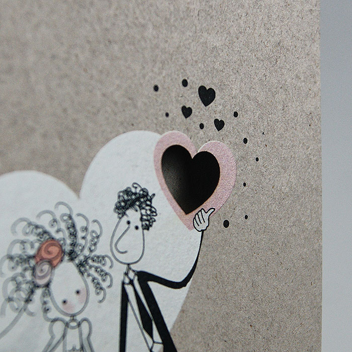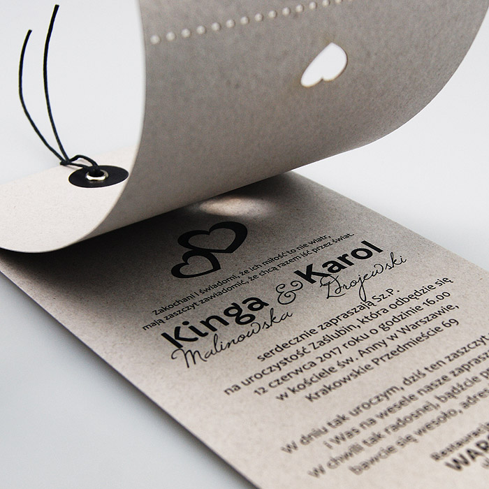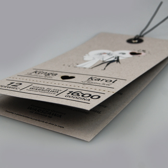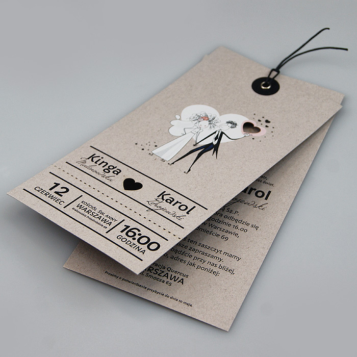 Nowoczesne zaproszenie w formie dwóch elementów wykonanych z wysokiej jakości ekologicznego papieru w kolorze beżowym połączonych nitem. Ozdobny motyw rysunkowej Pary Młodej wykonany innowacyjną techniką druku. Zaproszenie wysyłamy w formie gotowej do wręczenia. Zaproszenie wykonane z ogromną starannością i dbałością o detale. Precyzyjny nadruk, dokładność wykonania oraz wysokiej jakości papier. Do zaproszenia dodana jest ozdobna koperta (130g/m2) GRATIS.
