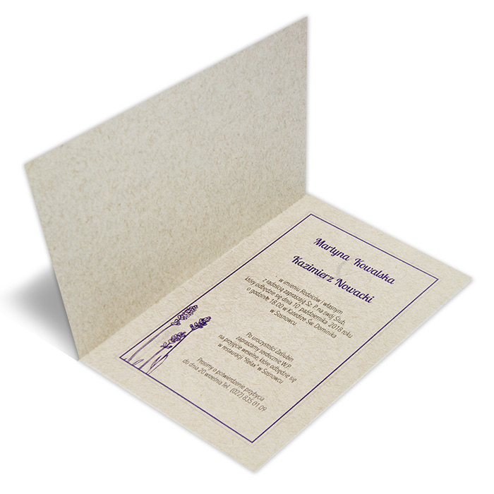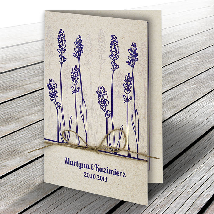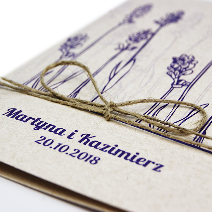 Wyjątkowe zaproszenie ślubne z motywem lawendy. Zaproszenie wykonane z ekologicznego matowego papieru w kolorze beżowymi z delikatną fakturą. Nadruk tekstu bezpośrednio na okładce. Uroku dodaje kokardka wykonana z jutowego sznurka. Zaproszenie wysyłamy w formie gotowej do wręczenia. Zaproszenie wykonane z ogromną starannością i dbałością o detale. Precyzyjny nadruk, dokładność wykonania oraz wysokiej jakości papier.