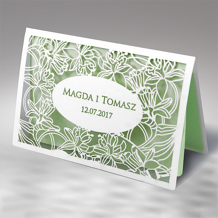 Wyjątkowe zaproszenie ślubne z misternym wycięciem laserowym na okładce. Zaproszenie wykonane z wysokiej jakości matowego papieru delikatnie fakturowanego w kolorze złamanej bieli. Wkładka do nadruku z w kolorze pastelowym miętowym. Zaproszenie wysyłamy w formie gotowej do wręczenia. Zaproszenie wykonane z ogromną starannością i dbałością o detale. Precyzyjny nadruk, dokładność wykonania oraz wysokiej jakości papier.