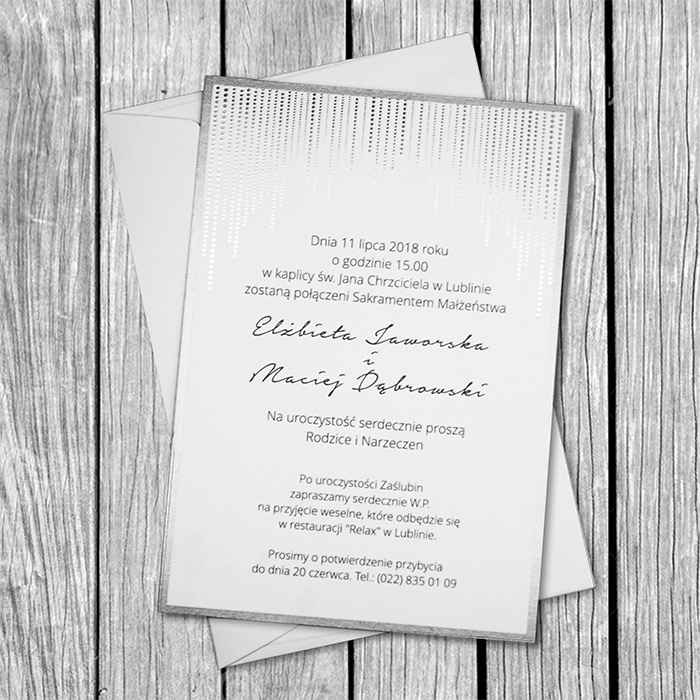 Nowoczesne zaproszenie jednostronne, wykonane z matowego białego papieru oraz podkładki z wysokiej jakości metalizowanego papieru barwionego w masie w kolorze srebrnym. Uroku dodaje subtelne srebrzenie, znajdujące się w górnej części zaproszenia. Zaproszenie wysyłamy w formie gotowej do wręczenia. Zaproszenie wykonane z ogromną starannością i dbałością o detale. Precyzyjny nadruk, dokładność wykonania oraz wysokiej jakości papier.