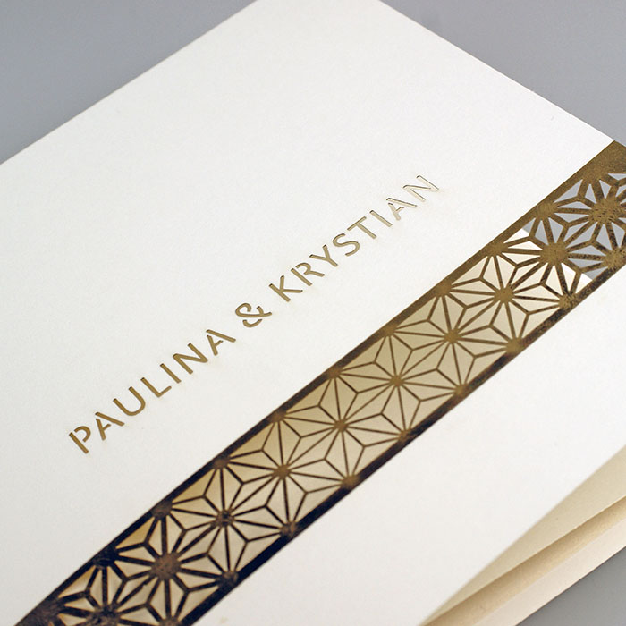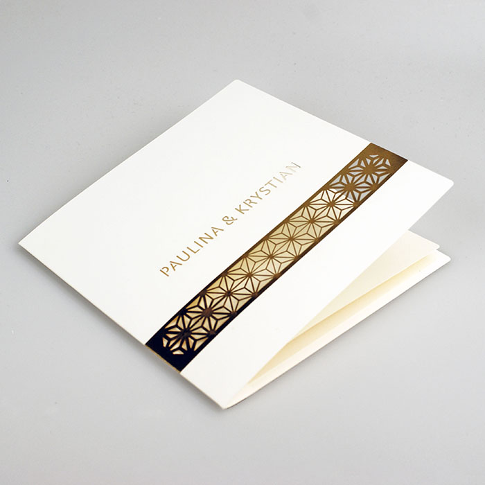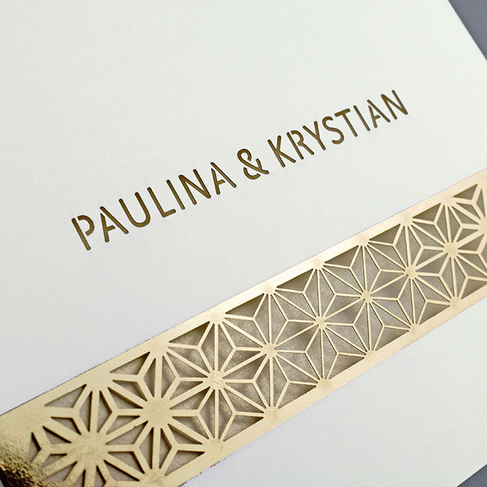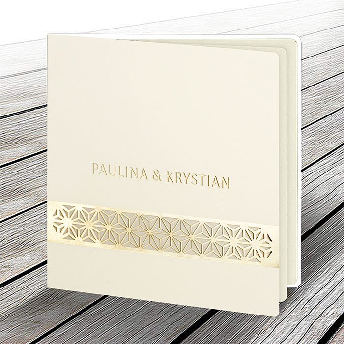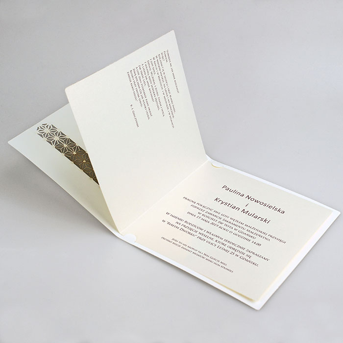 Wyjątkowe zaproszenie z nowoczesnym wzorem wykonanym techniką złocenia i cięcia laserowego. Okładka wykonana z ozdobnego matowego papieru w kolorze ecru. Wkładka do nadruku wykonana z wysokiej jakości metalizowanego papieru w kolorze ecru. Zaproszenie wysyłamy w formie gotowej do wręczenia. Wykonane z ogromną starannością i dbałością o detale. Precyzyjny nadruk, dokładność wykonania oraz wysokiej jakości papier.