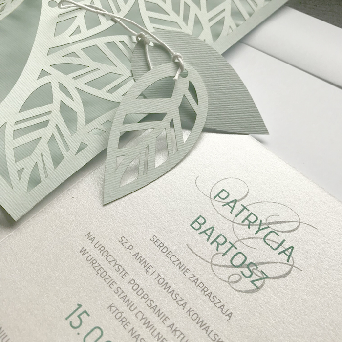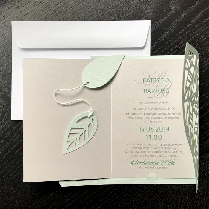 Zaproszenie w formie bramki, wykonane z wysokiej jakości lekko fakturowanego papieru barwionego w masie w odcieniu miętowym. Okładkę ozdabia ażurowe wycięcie laserowe z motywem liści. Uroku dodają dwa wycięte laserowo listki przewiązane woskowym sznurkiem w kolorze białym. Wkładka do nadruku tekstu z metalizowanego papieru w odcieniu lodowym dająca delikatne tło wycięciu laserowemu. Zaproszenie wysyłamy w formie gotowej do wręczenia. Zaproszenie wykonane z ogromną starannością i dbałością o detale. Precyzyjny nadruk, dokładność wykonania oraz wysokiej jakości papier. Do zaproszenia dodana jest ozdobna koperta (130g/m2) GRATIS.