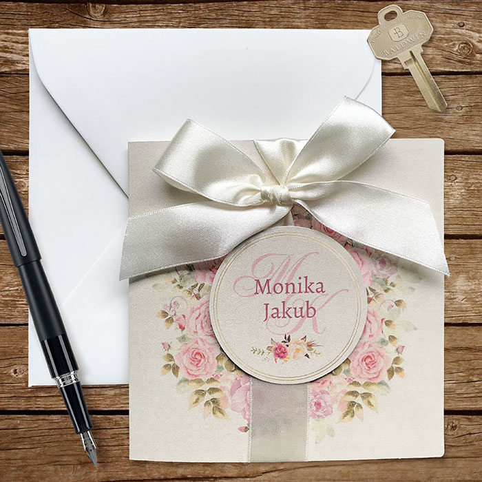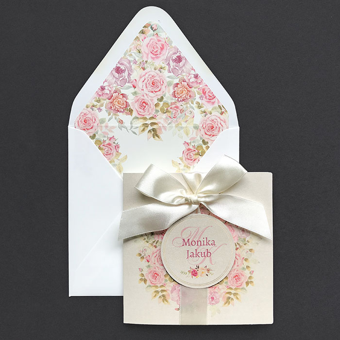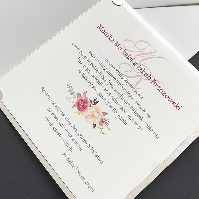 Wyjątkowe zaproszenie ślubne z motywem malowanych kwiatów w formie wianka z okrągłą aplikacją, na której nadrukowane są imiona Młodej Pary. Wokół aplikacji ramka wykonana miedzianą folią. Zaproszenie przewiązane szeroką satynową wstążką w kolorze ecru. Zaproszenie wykonane z wysokiej jakości metalizowanego papieru w kolorze ecru. Wkładka do nadruku wykonana z matowego papieru w kolorze ecru. Uroku dodaje kolorowa kwiatowa wkładka w kopercie tworząca wyjątkowy komplet. Zaproszenie wysyłamy w formie gotowej do wręczenia. Zaproszenie wykonane z ogromną starannością i dbałością o detale. Precyzyjny nadruk, dokładność wykonania oraz wysokiej jakości papier.