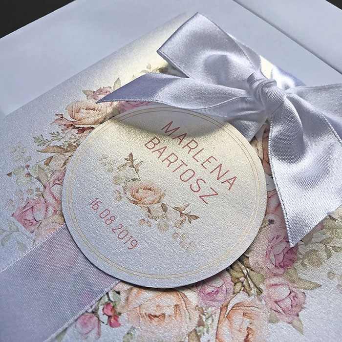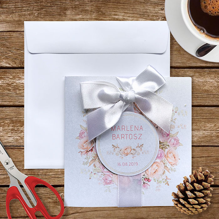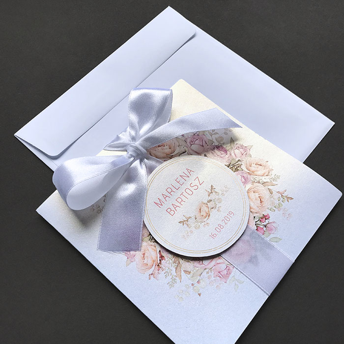 Wyjątkowe zaproszenie ślubne z motywem malowanych kwiatów w formie wianka z okrągłą aplikacją, na której nadrukowane są imiona Młodej Pary. Wokół aplikacji ramka wykonana miedzianą folią. Zaproszenie przewiązane szeroką białą satynową wstążką. Zaproszenie wykonane z wysokiej jakości metalizowanego białego papieru. Wkładka do nadruku białą matowa. Zaproszenie wysyłamy w formie gotowej do wręczenia. Zaproszenie wykonane z ogromną starannością i dbałością o detale. Precyzyjny nadruk, dokładność wykonania oraz wysokiej jakości papier.
