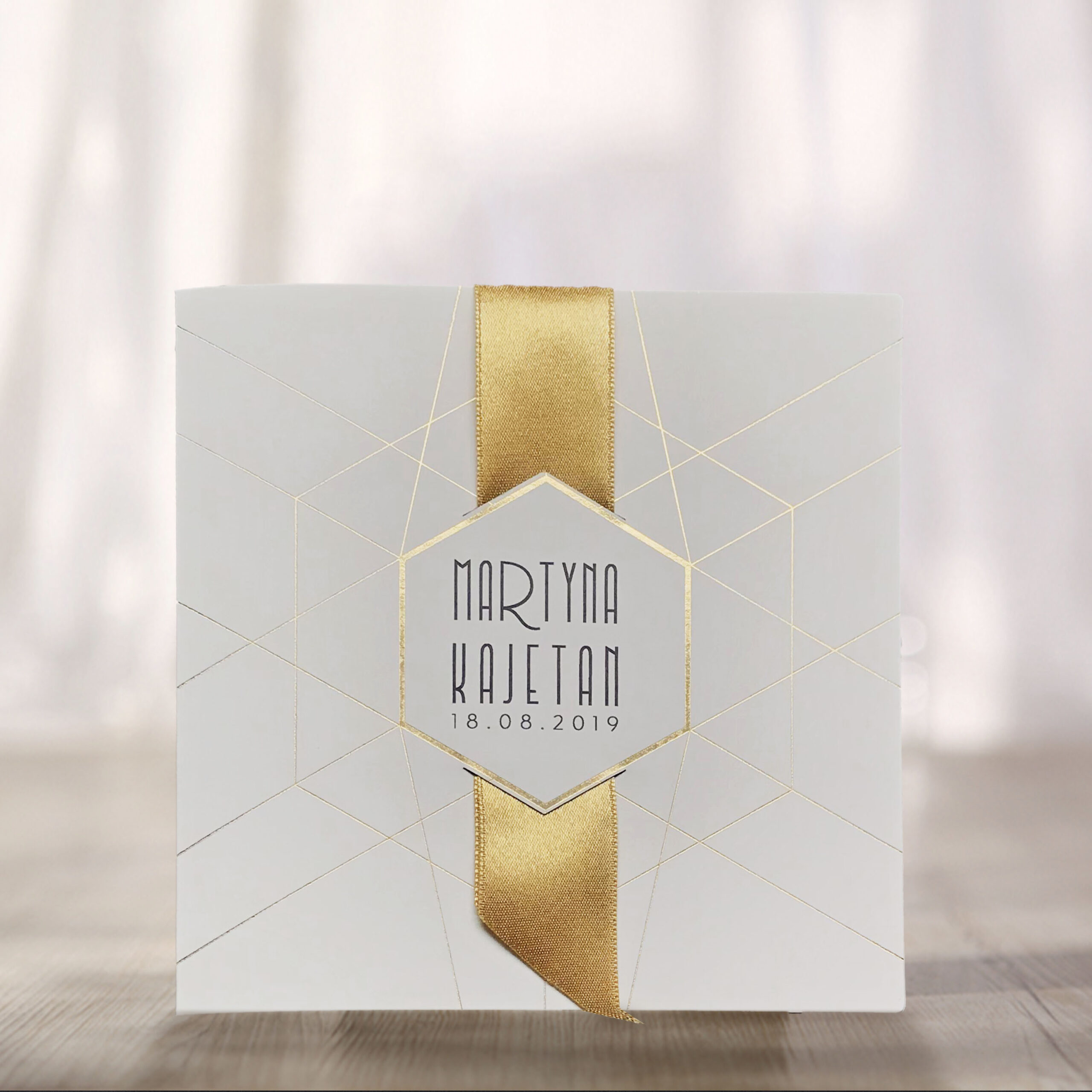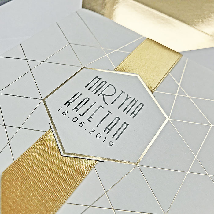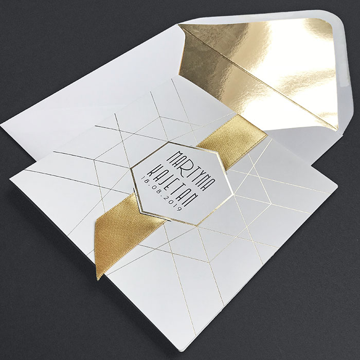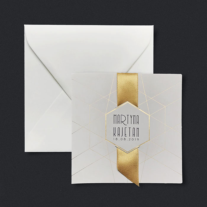 Zaproszenie z matowego ozdobnego papieru w kolorze ecru z subtelnym geometrycznym złoceniem. W centralnej części miejsce do nadruku imion Młodej Pary oraz daty ślubu. Zaproszenie przewiązane szeroką satynową wstążką w kolorze złotym. Środek zaproszenia z wysokiej jakości metalizowanego papieru w kolorze starego złota. Ozdobna koperta ze złotą wkładką tworzy elegancki komplet. Zaproszenie wysyłamy w formie gotowej do wręczenia. Zaproszenie wykonane z ogromną starannością i dbałością o detale. Precyzyjny nadruk, dokładność wykonania oraz wysokiej jakości papier.