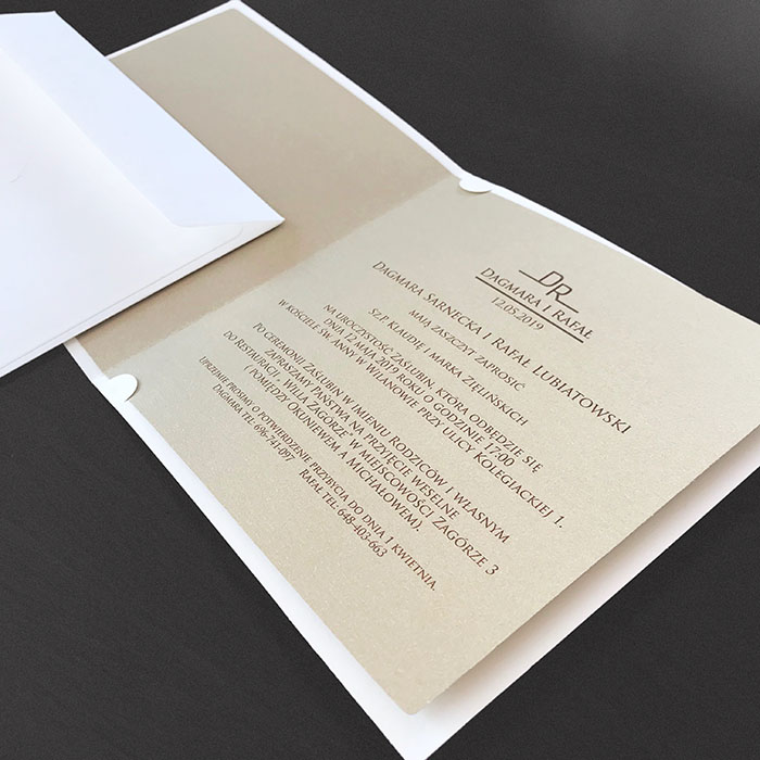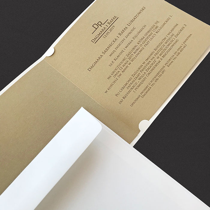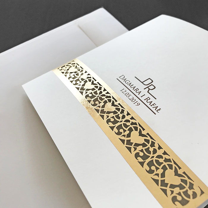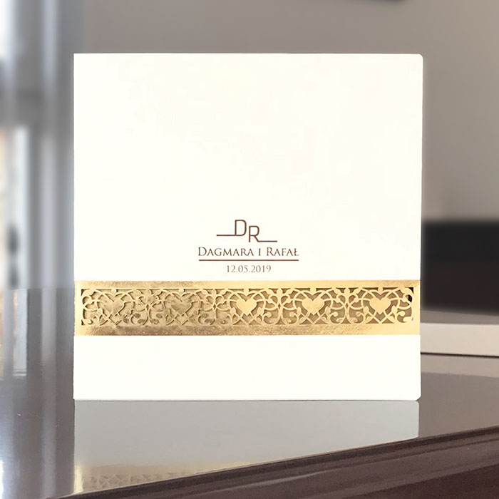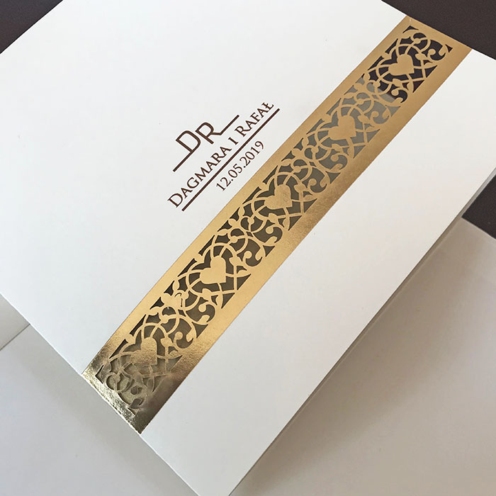 Wyjątkowe zaproszenie z nowoczesnym wzorem wykonanym techniką złocenia i cięcia laserowego. Okładka wykonana z ozdobnego matowego papieru w kolorze ecru. Wkładka do nadruku wykonana z wysokiej jakości metalizowanego papieru w kolorze starego złota. Zaproszenie wysyłamy w formie gotowej do wręczenia. Wykonane z ogromną starannością i dbałością o detale. Precyzyjny nadruk, dokładność wykonania oraz wysokiej jakości papier.