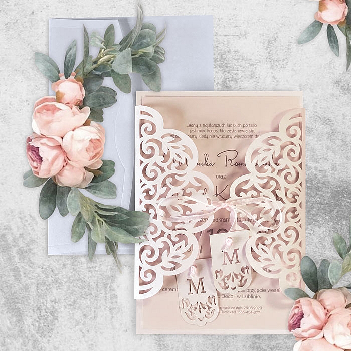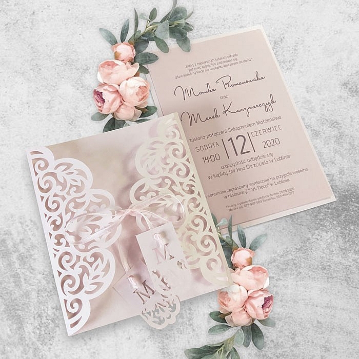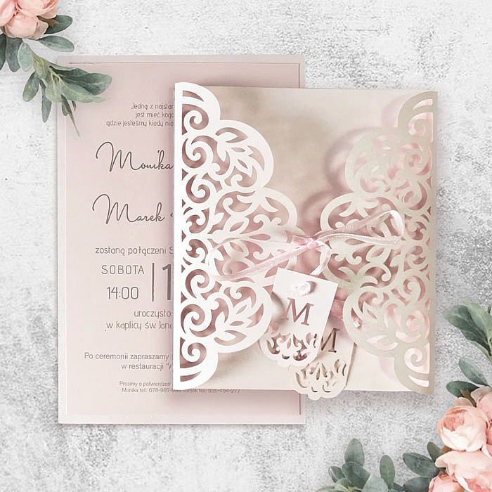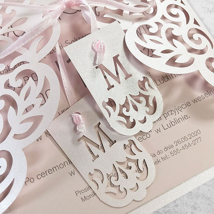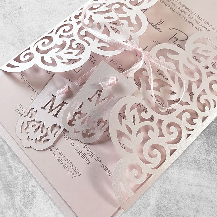 Zaproszenie w formie bramki, wykonane z wysokiej jakości papierów barwionych w masie. Okładkę z metalizowanego papieru w delikatnym różowym odcieniu ozdabia ażurowe wycięcie laserowe. Uroku dodają zawieszki z inicjałami Młodej Pary przywiązane do satynowej kokardki. Wkładka do nadruku tekstu matowa w kolorze pudrowego różu, podklejona do metalizowanej podkładki. Zaproszenie wysyłamy w formie gotowej do wręczenia. Zaproszenie wykonane z ogromną starannością i dbałością o detale. Precyzyjny nadruk, dokładność wykonania oraz wysokiej jakości papier.