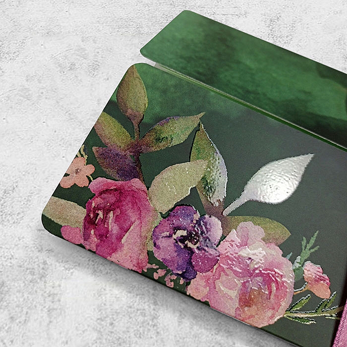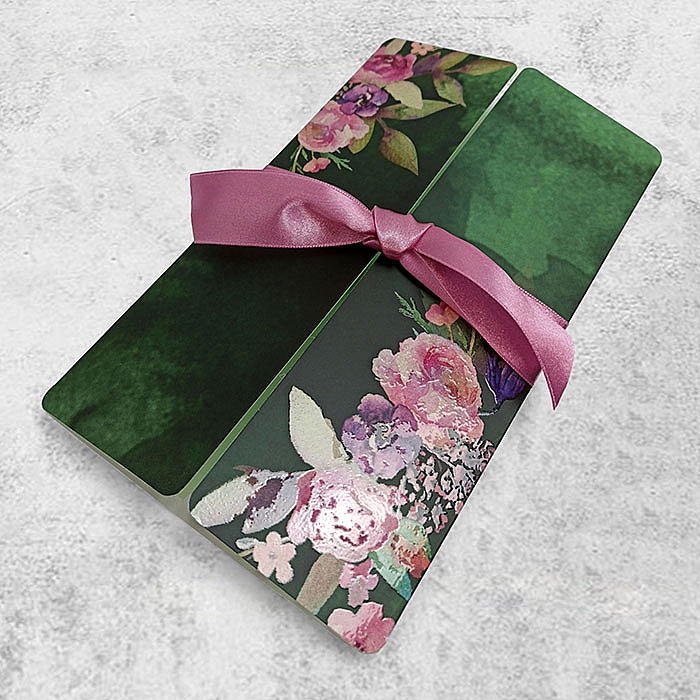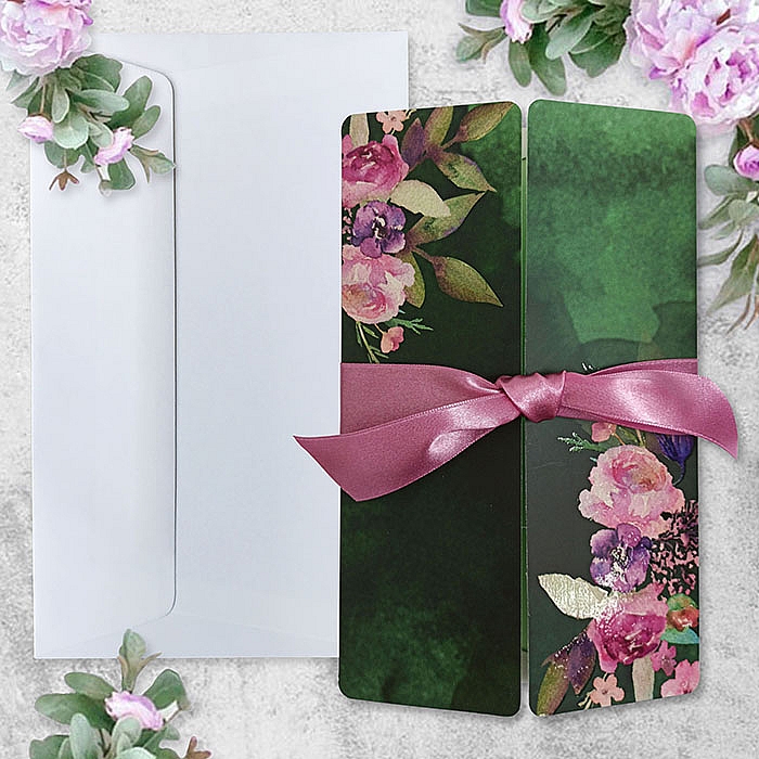 Zaproszenie z limitowanej serii w formie bramki, wykonane matowego papieru pokrytego satynową folią przyjemną w dotyku. Nadruk ozdobnego motywu roślinnego uszlachetniony lakierem wybiórczym dającym efekt kropli wody.