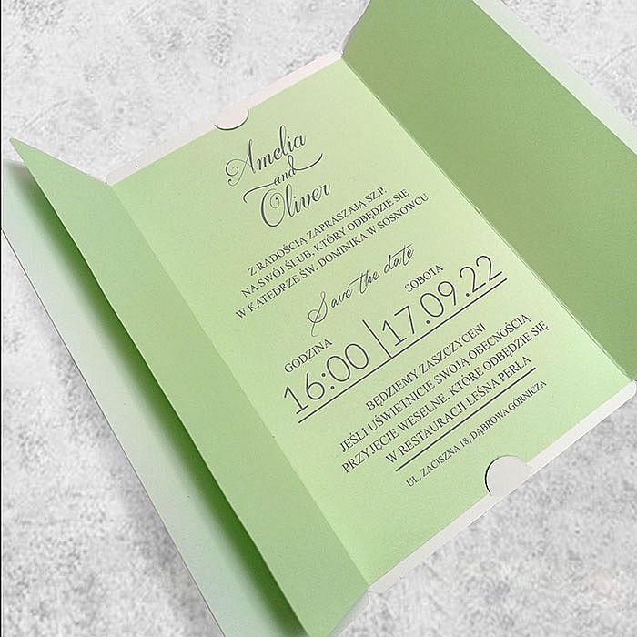 Wkładka do nadruku tekstu wykonana z matowego, ozdobnego papieru barwionego w masie w odcieniu jasnej, pastelowej zieleni. Uroku dodaje satynowa wstążka, którą przewiązane jest zaproszenie.