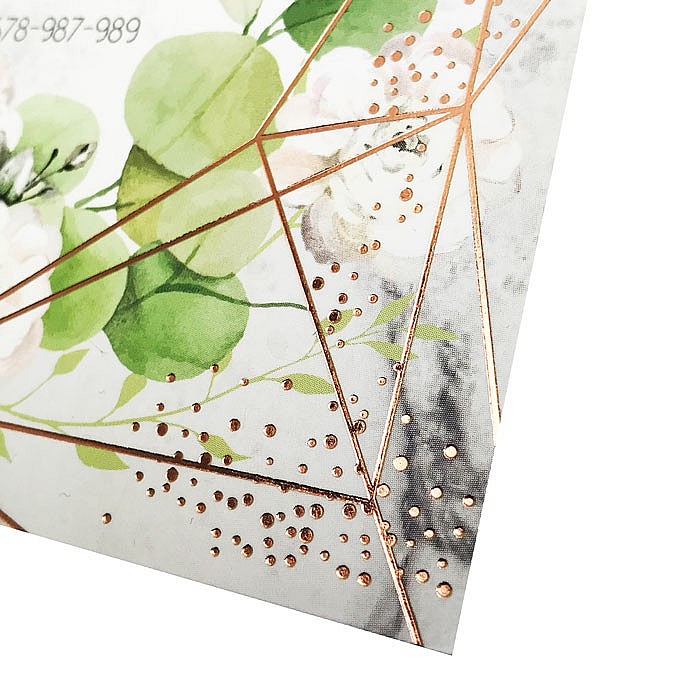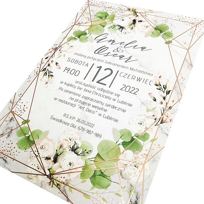 Jednostronne, nowoczesne, zaproszenie z limitowanej serii, wykonane matowego papieru pokrytego satynową, przyjemną w dotyku folią. Nadruk kwiatowego motywu, uszlachetniony lakierem punktowym oraz hotstampingiem w kolorze miedzianym.