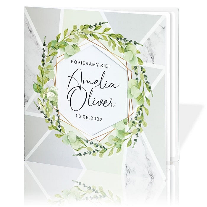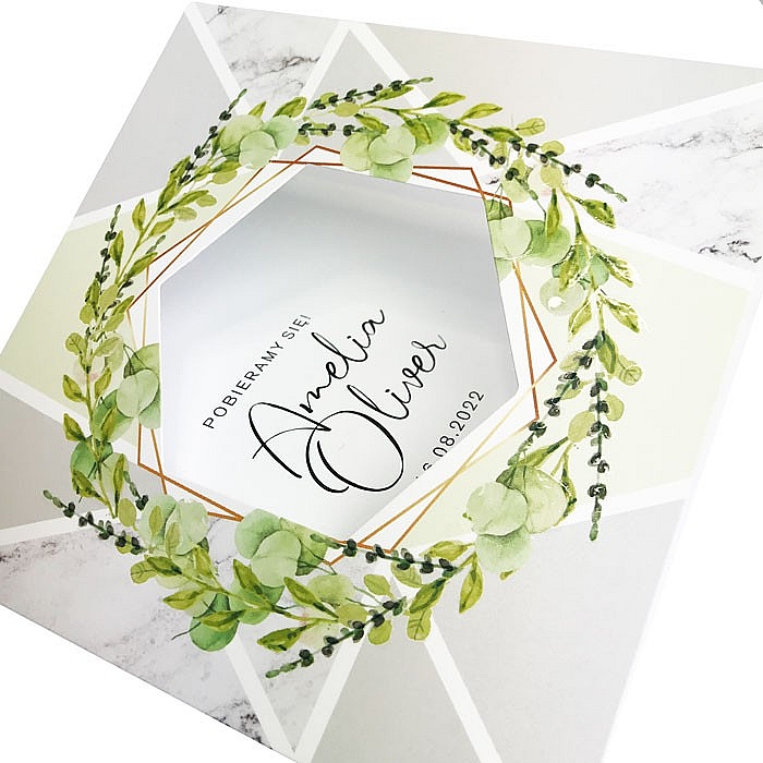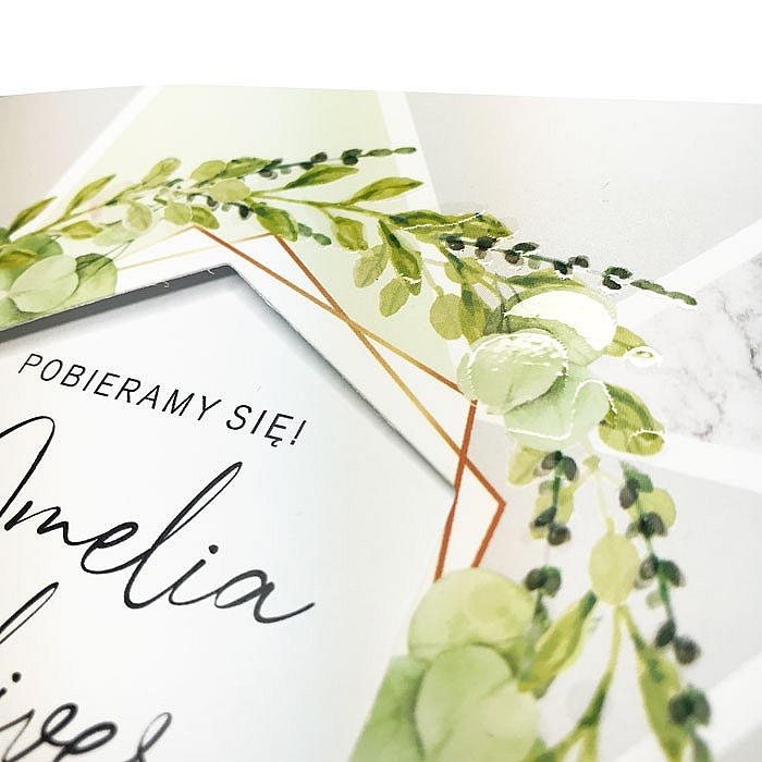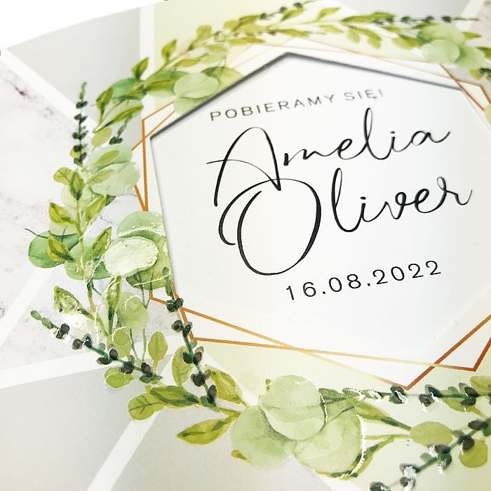 Zaproszenie z limitowanej serii wykonane matowego papieru pokrytego satynową, przyjemną w dotyku folią. Nadruk ozdobnego motywu kwiatowego uszlachetniony lakierem wybiórczym oraz złoceniem. W odróżnieniu od zaproszeń konkurencji nie jest to imitacja tylko prawdziwe uszlachetnienie. Elementy wykonane techniką uszlachetnienia mienią się, a pod palcami wyczuwalna jest wysoka jakość, nie jest to jedynie nadrukowany efekt złocenia. W centralnej części wycięty heksagon w którym widoczne są imiona Młodej Pary, nadrukowane na wkładce. Wkładka do nadruku biała matowa. Zaproszenie wysyłamy w formie gotowej do wręczenia. Zaproszenie wykonane z ogromną starannością i dbałością o detale. Precyzyjny nadruk, dokładność wykonania oraz wysokiej jakości papier.