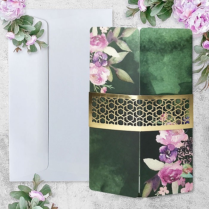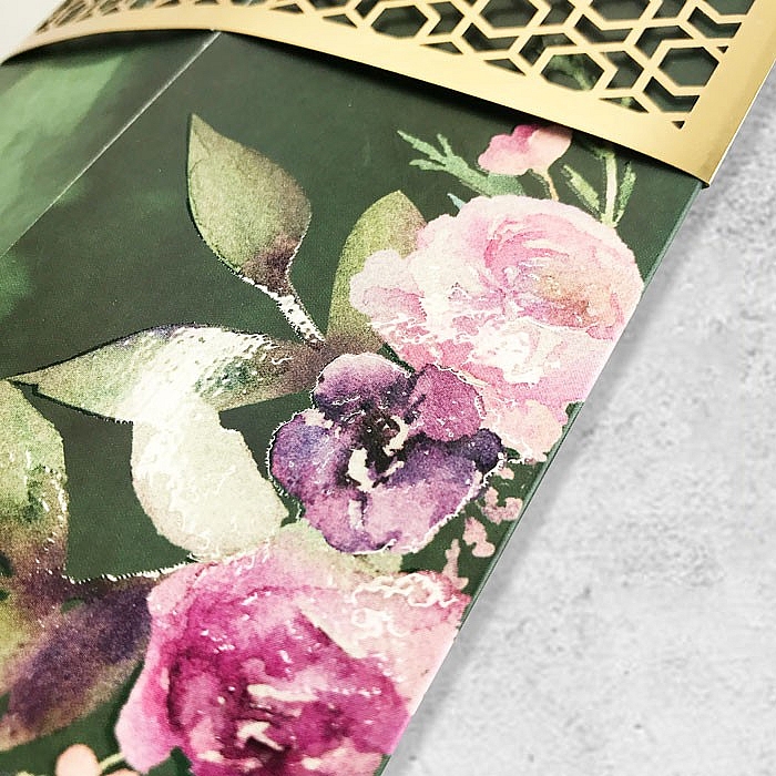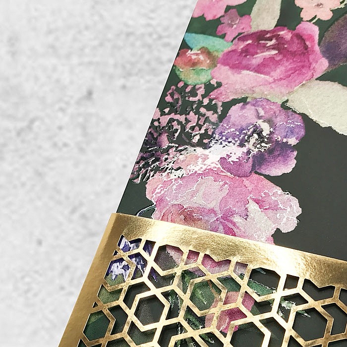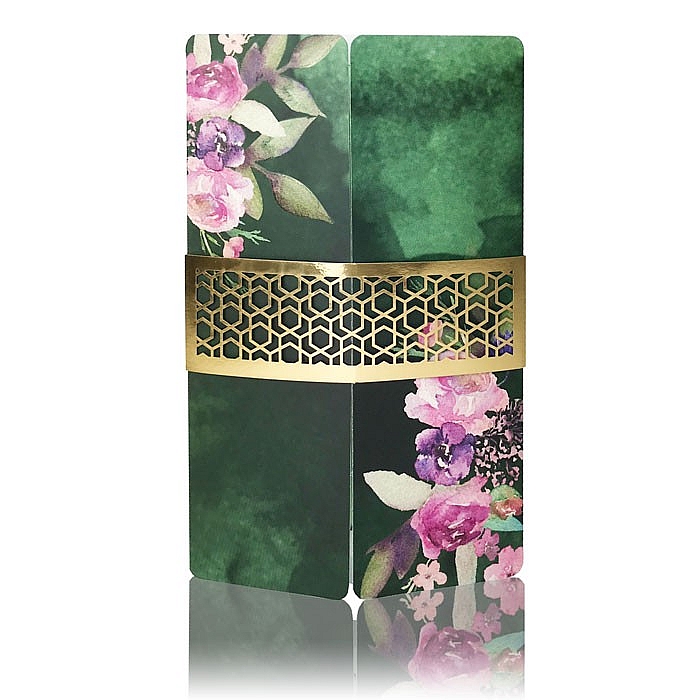 Zaproszenie w formie bramki wykonane z matowego papieru pokrytego satynową folią przyjemną w dotyku. Nadruk ozdobnego motywu roślinnego uszlachetniony lakierem wybiórczym dającym efekt kropli wody. Wkładka do nadruku tekstu wykonana z papieru barwionego w masie w kolorze jasnej zieleni.