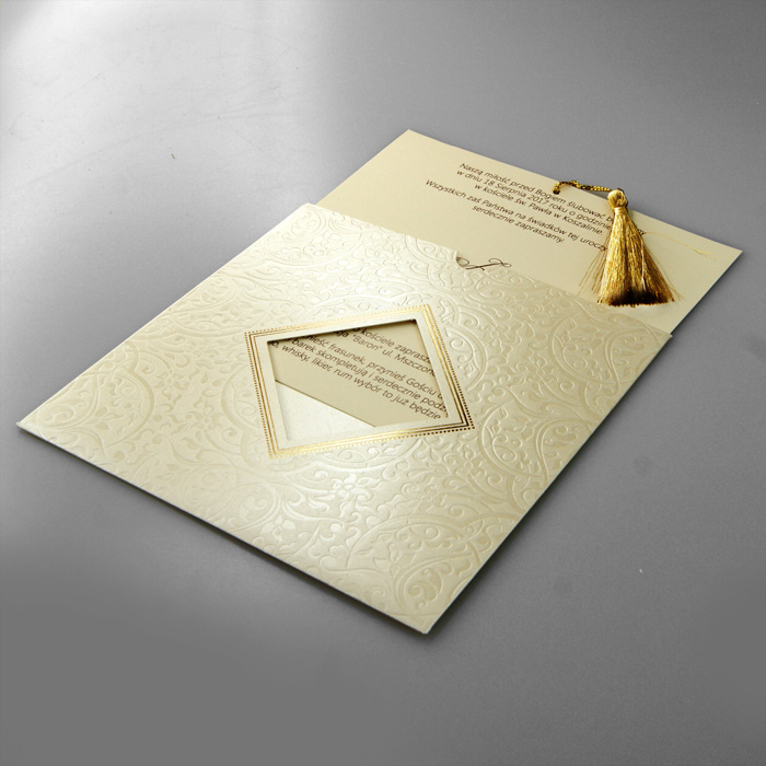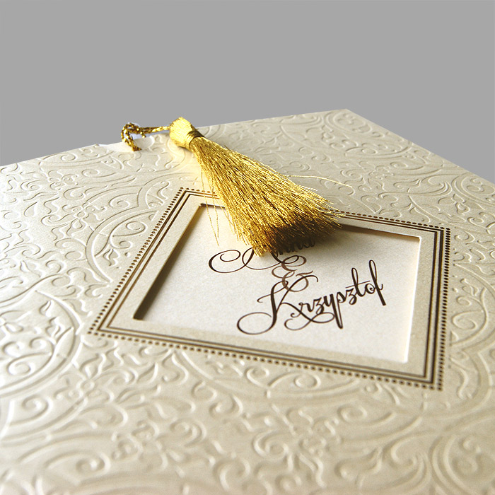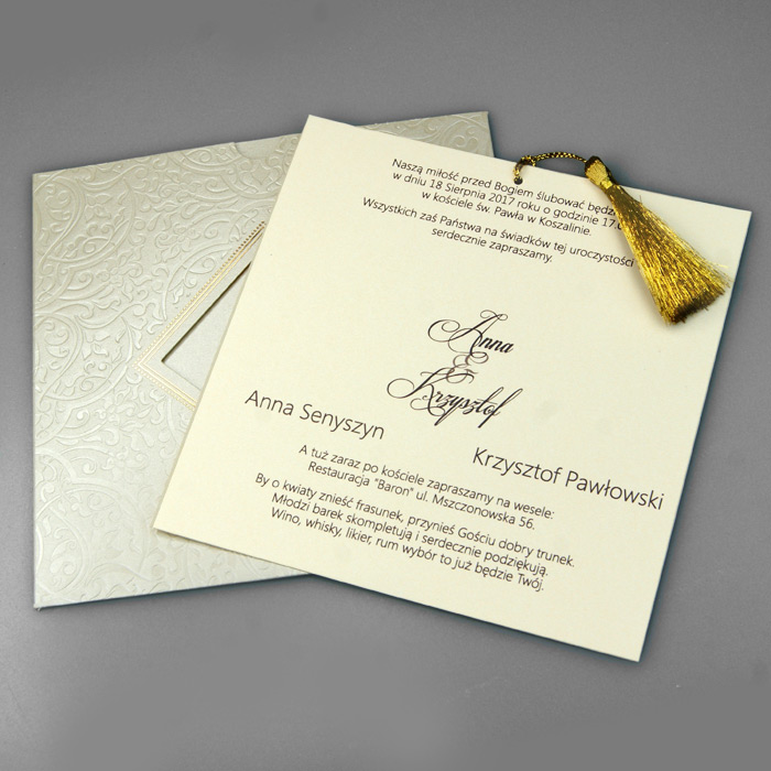 Oryginalne zaproszenie wykonane z wysokiej jakości metalizowanego papieru. Okładka wykonana w formie kieszonki z fantazyjnym motywem tłoczenia. W centralnej części znajduje się wycięcie w formie kwadratu, przez które widoczne są imiona Młodej Pary. Wkładka do nadruku z wysokiej jakości matowego papieru w kolorze ecru. Uroku dodaje złoty sznureczek przymocowany do wkładki. Zaproszenie wysyłamy w formie gotowej do wręczenia. Wykonane z ogromną starannością i dbałością o detale. Precyzyjny nadruk, dokładność wykonania oraz wysokiej jakości papier.