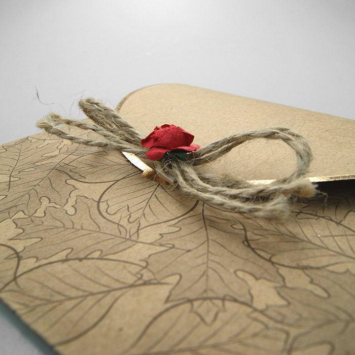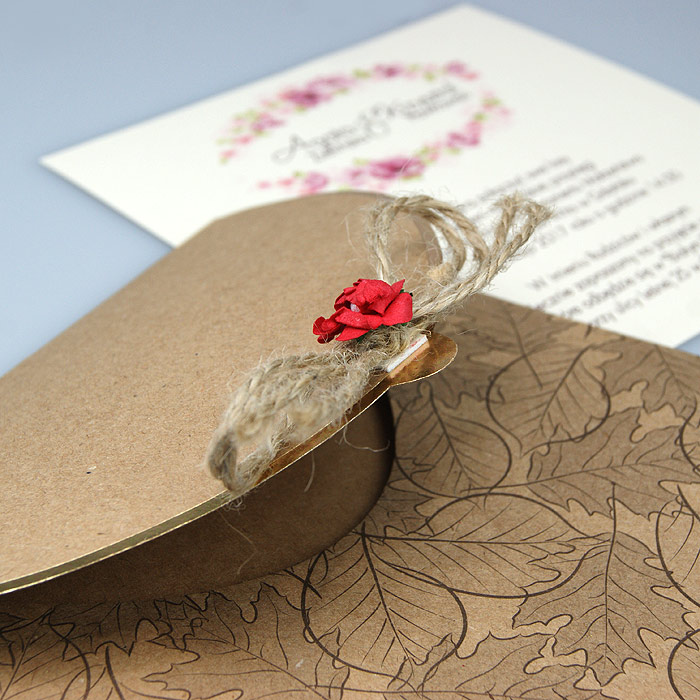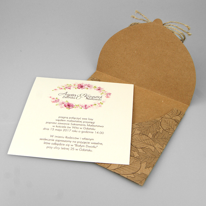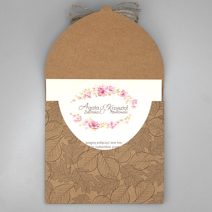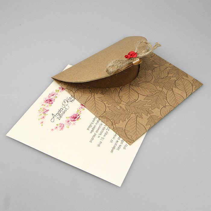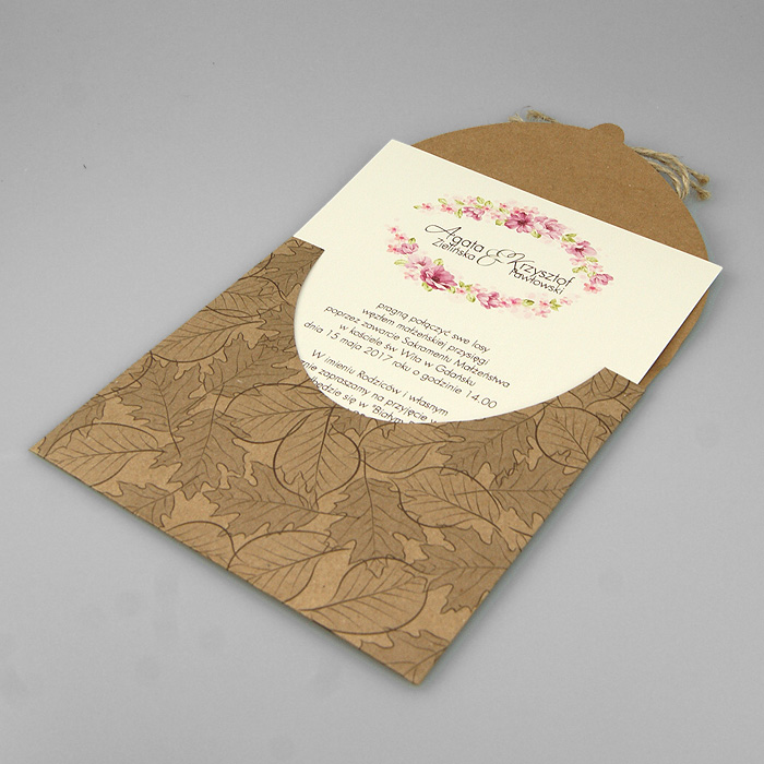 Oryginalne zaproszenie wykonane z matowego , ekologicznego papieru. Okładka w formie kieszonki-kopertki, z nadrukowanymi motywami roślinnymi. Brzeg kieszonki został. Wkładka z wysokiej jakości jednostronnie fakturowanego papieru w kolorze ecru. Zaproszenie wysyłamy w formie gotowej do wręczenia. Wykonane z ogromną starannością i dbałością o detale. Precyzyjny nadruk, dokładność wykonania oraz wysokiej jakości papier.