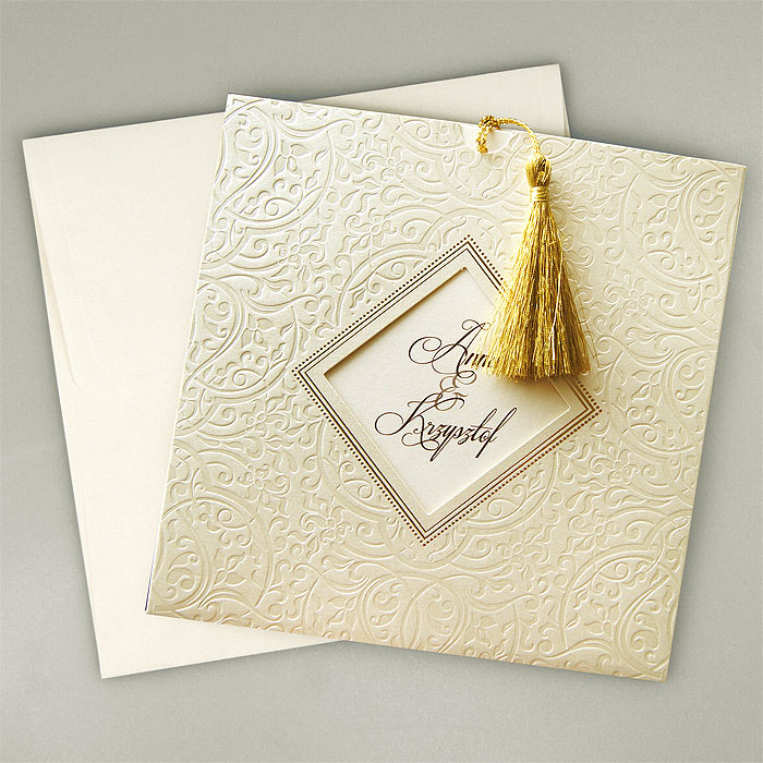 Eleganckie zaproszenie. Wkładka wykonana z fakturowanego papieru w kolorze ecru. Dodatkowo na wkładce został wytłoczony wzór. Podkładka perłowa w kolorze ecru ze złotym brzegiem. Dodatkową ozdobą jest mała perełka. Koperta perłowa w kolorze ecru.