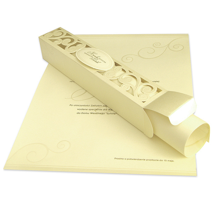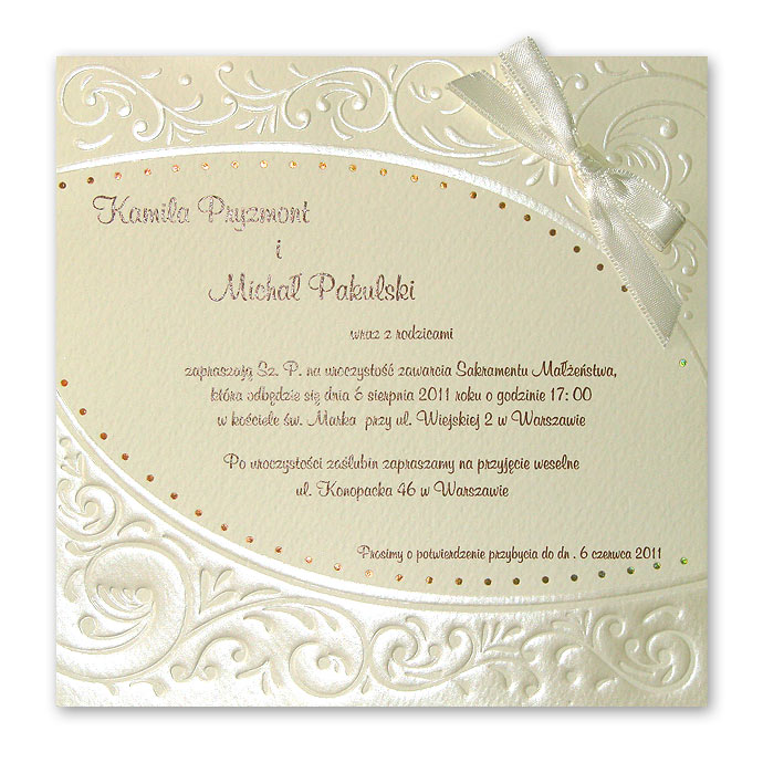 Eleganckie zaproszenie. Wkładka wykonana z fakturowanego papieru w kolorze ecru. Dodatkowo na wkładce został wytłoczony wzór. Podkładka perłowa w kolorze ecru ze złotym brzegiem. Dodatkową ozdobą jest mała perełka. Koperta perłowa w kolorze ecru.