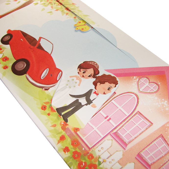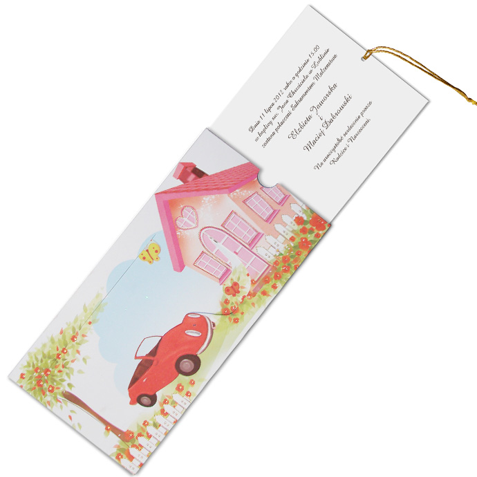 Zabawne zaproszenie z najnowszej kolekcji,które przedstawia humorystyczną scenkę. Gdy wysuwamy wkładkę pociągając za złoty sznurek Młoda Para przechodzi z samochodu do domu. Dodatkową ozdobą są delikatne złocenia. Wkładka do nadruku wykonana z tego samego papieru. Zaproszenie wysyłamy w formie gotowej do wręczenia. Zaproszenie wykonane z ogromną starannością i dbałością o detale. Precyzyjny nadruk, dokładność wykonania oraz wysokiej jakości papier.