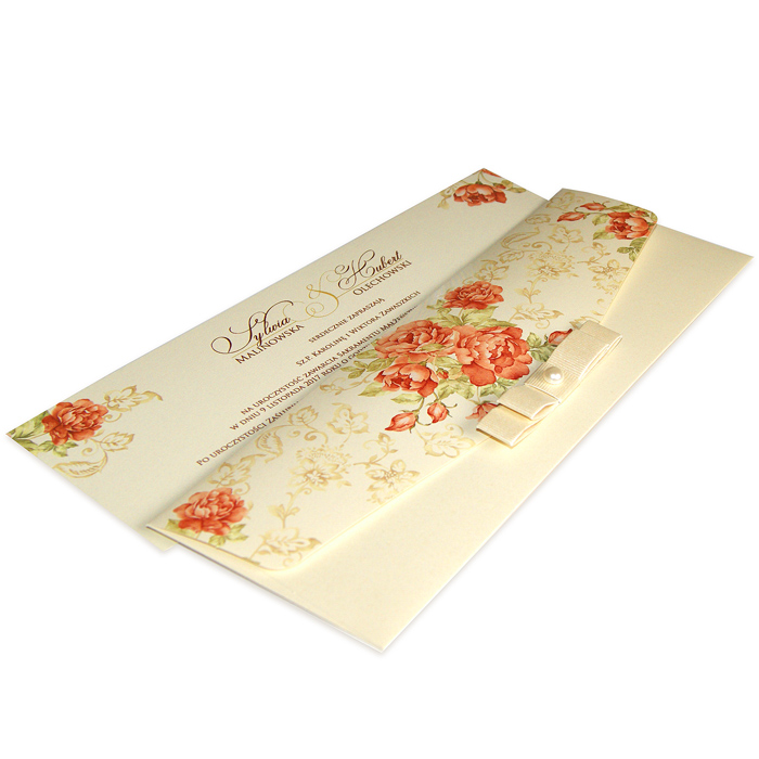 Eleganckie zaproszenie w formie pudełeczka wykonane z wysokiej jakości perłowego papieru w kolorze ecru. Nadruk treści zaproszenia na matowym papierze w kolorze ecru z perłowymi zdobieniami, nawiązującymi do motywu wytłoczonego i wyciętego laserowo na pudełku. Zaproszenie wykonane z ogromną starannością i dbałością o detale. Precyzyjny nadruk, dokładność wykonania oraz wysokiej jakości papier.