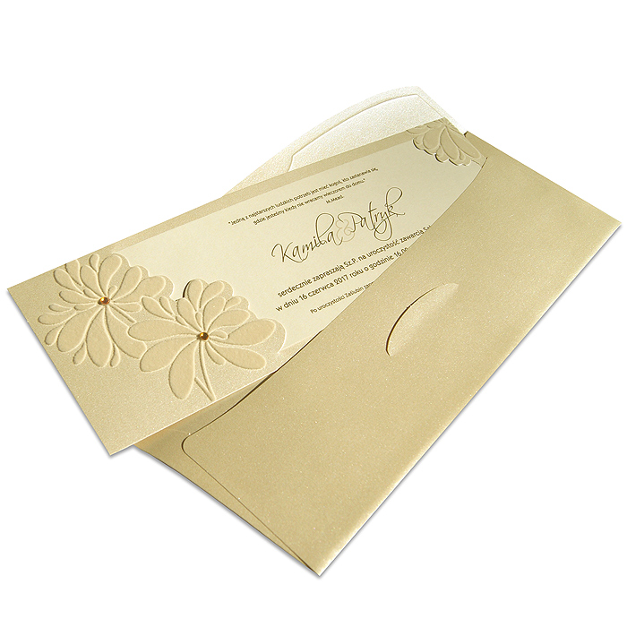 Eleganckie zaproszenie w formie pudełeczka wykonane z wysokiej jakości perłowego papieru w kolorze ecru. Nadruk treści zaproszenia na matowym papierze w kolorze ecru z perłowymi zdobieniami, nawiązującymi do motywu wytłoczonego i wyciętego laserowo na pudełku. Zaproszenie wykonane z ogromną starannością i dbałością o detale. Precyzyjny nadruk, dokładność wykonania oraz wysokiej jakości papier.