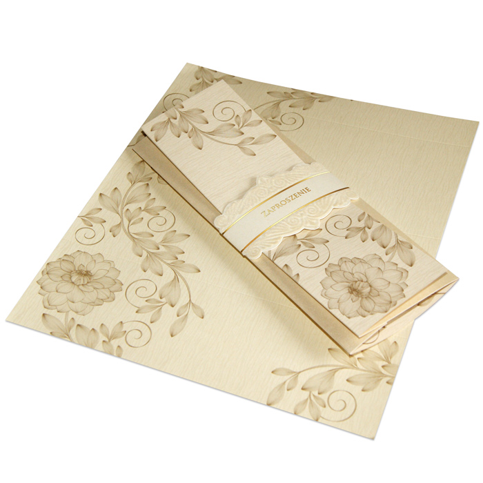 Eleganckie zaproszenie wykonane z delikatnie fakturowanego papieru. Okładkę ozdabia flockowy klasyczny ornament, dający wrażenie miękkiego puchu. Wyjątkową ozdobą jest aplikacja w postaci wstążki z przyklejoną perełką. Wkładka do nadruku tekstu, dopasowana do okładki, delikatnie fakturowana w kolorze ecru. Zaproszenie wysyłamy w formie gotowej do wręczenia. Zaproszenie wykonane z ogromną starannością i dbałością o detale. Precyzyjny nadruk, dokładność wykonania oraz wysokiej jakości papier.