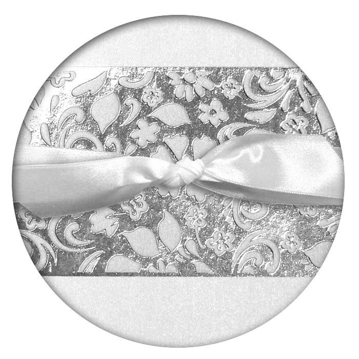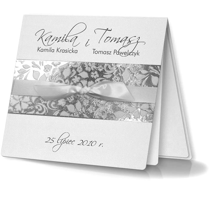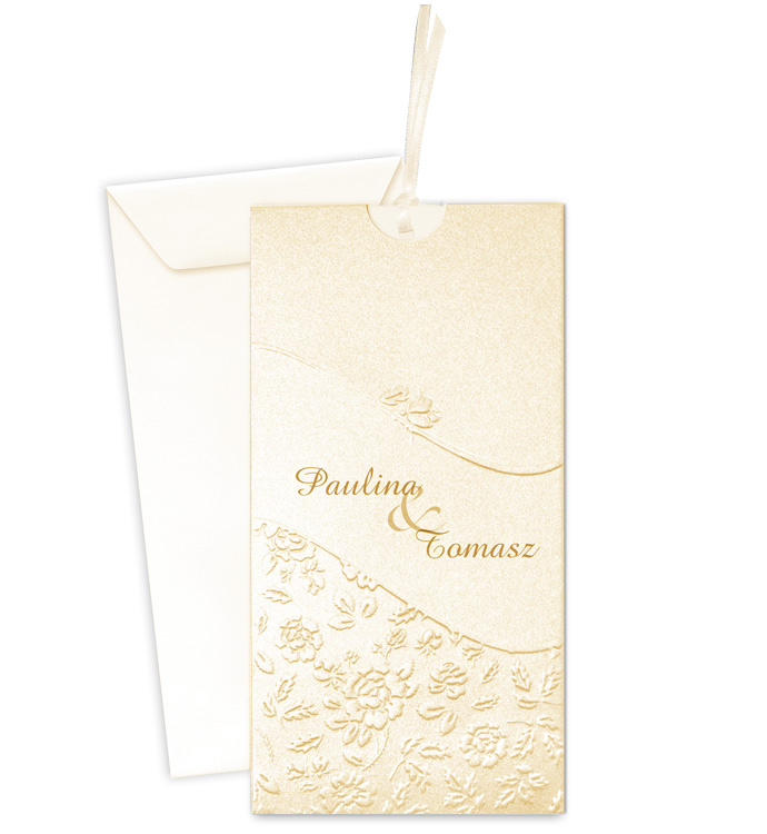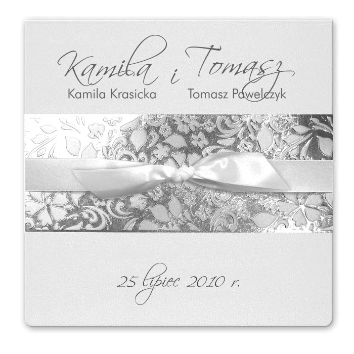 Delikatne zaproszenie w kolorze białym mieniącym się. Na okładce ozdobne tłoczenie ornamentów kwiatowych przewiązane białą wstążeczką. Środek w kolorze białym. Imiona i data na okładce, drukowane są tylko w przypadku zamienia z nadrukiem.