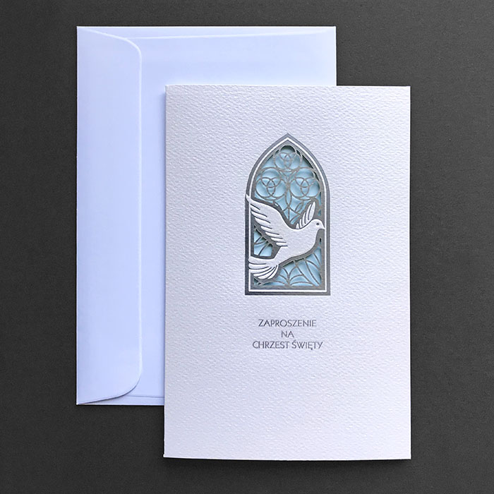 Zaproszenia na chrzest święty, wykonane z wysokiej jakości metalizowanego papieru z delikatną fakturą. Okładka z motywem wykonanym techniką ciecia laserowego, srebrzenia i tłoczenia. Wkładka do nadruku w kolorze jasno niebieskim. Zaproszenie wysyłamy w formie gotowej do wręczenia. Zaproszenie wykonane z ogromną starannością i dbałością o detale. Precyzyjny nadruk, dokładność wykonania oraz wysokiej jakości papier.