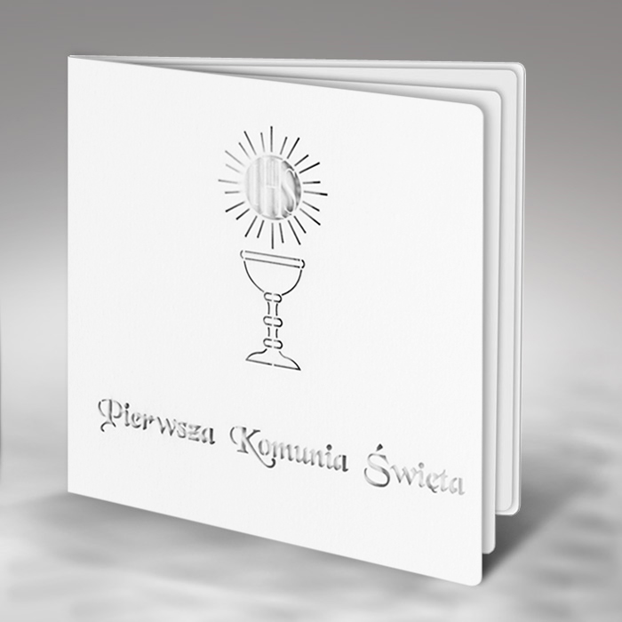 Zaproszenie wykonane z matowego papieru w kolorze białym. Zdobienia zostały wytłoczone, ozdobny pasek z przyklejoną perłową aplikacją został wykonany metodą hot print perłową folią. Wkładka do nadruku matowa w kolorze białym.