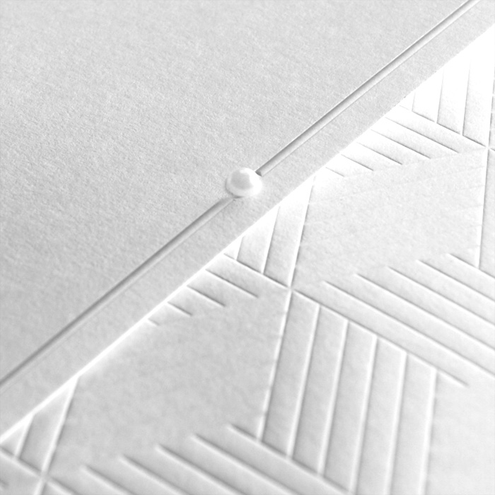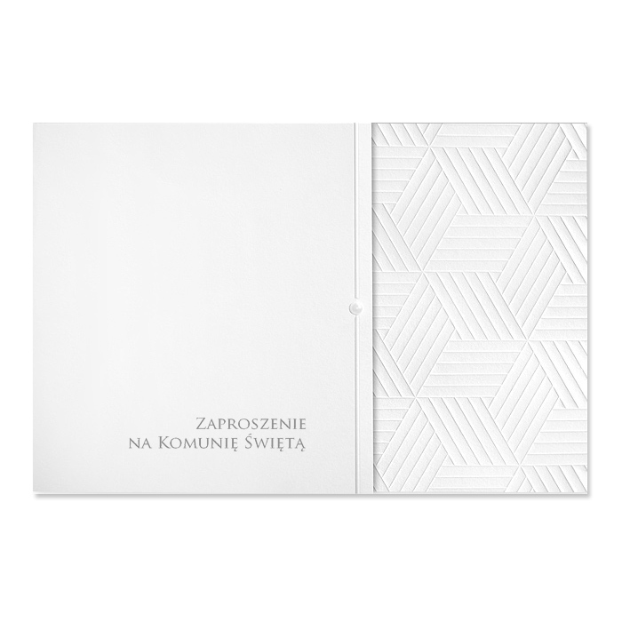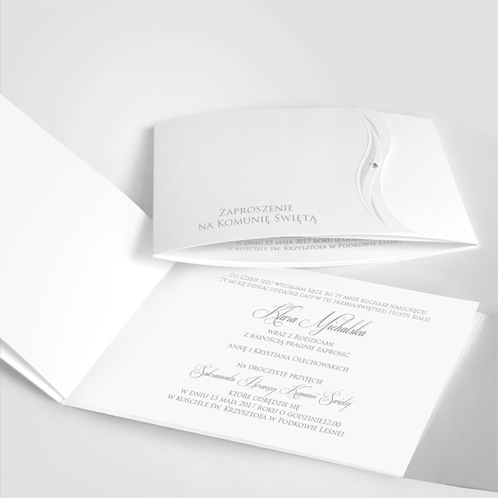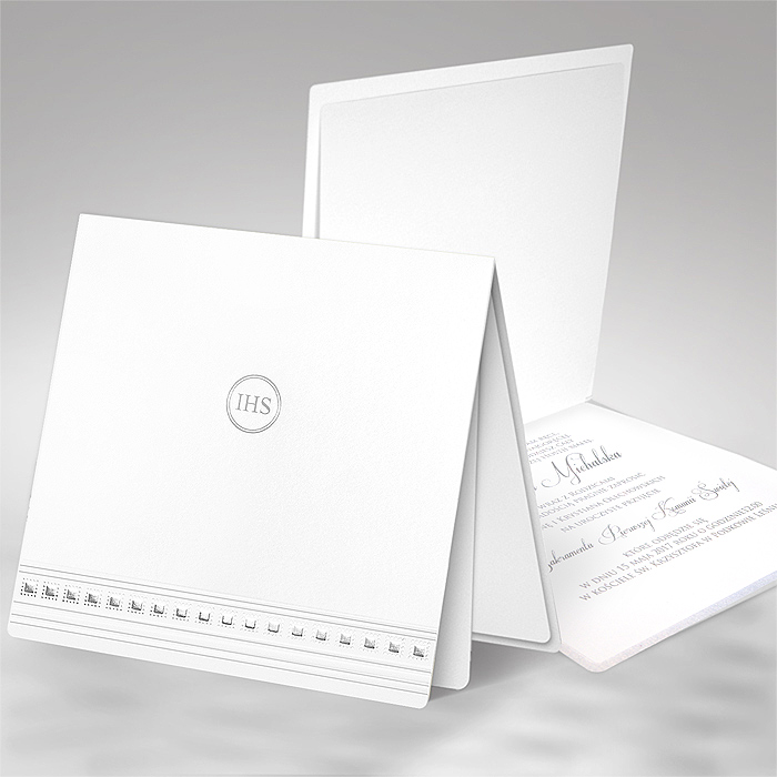 Zaproszenie wykonane z matowego papieru w kolorze białym. Zdobienia zostały wytłoczone, ozdobny pasek z przyklejoną perłową aplikacją został wykonany metodą hot print perłową folią. Wkładka do nadruku matowa w kolorze białym.