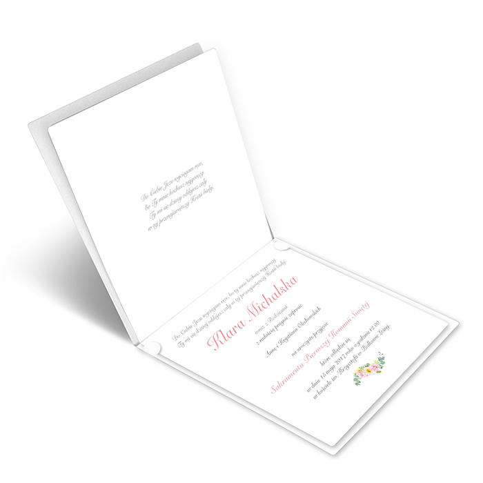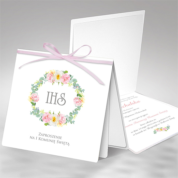 Wyjątkowe zaproszenie wykonane z matowego , białego papieru. Okładkę ozdabia kolorowa ilustracja przedstawiająca komunijny wianek. Wkładka do nadruku biała matowa. Uroku dodaje satynowa różowa wstążka. Zaproszenie wysyłamy w formie gotowej do wręczenia. Wykonane z ogromną starannością i dbałością o detale. Precyzyjny nadruk, dokładność wykonania oraz wysokiej jakości papier. Minimalna ilość zamawianych zaproszeń wynosi 15 szt.